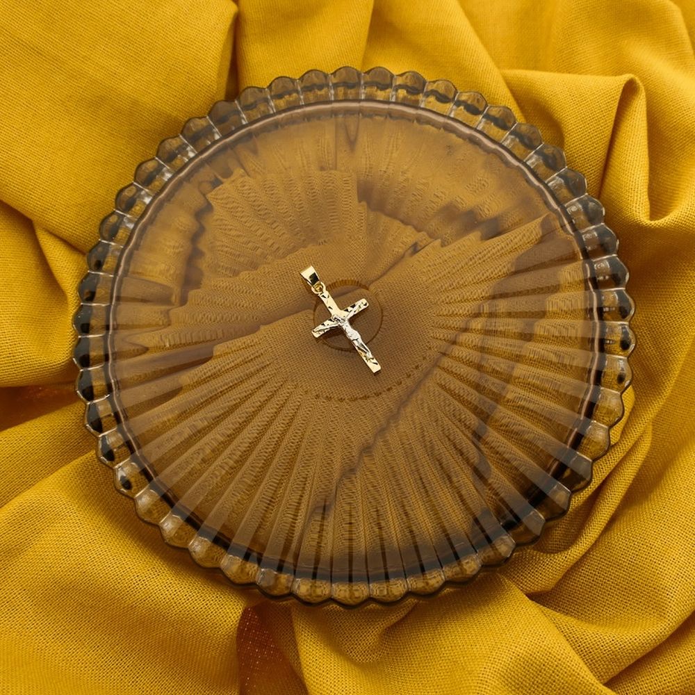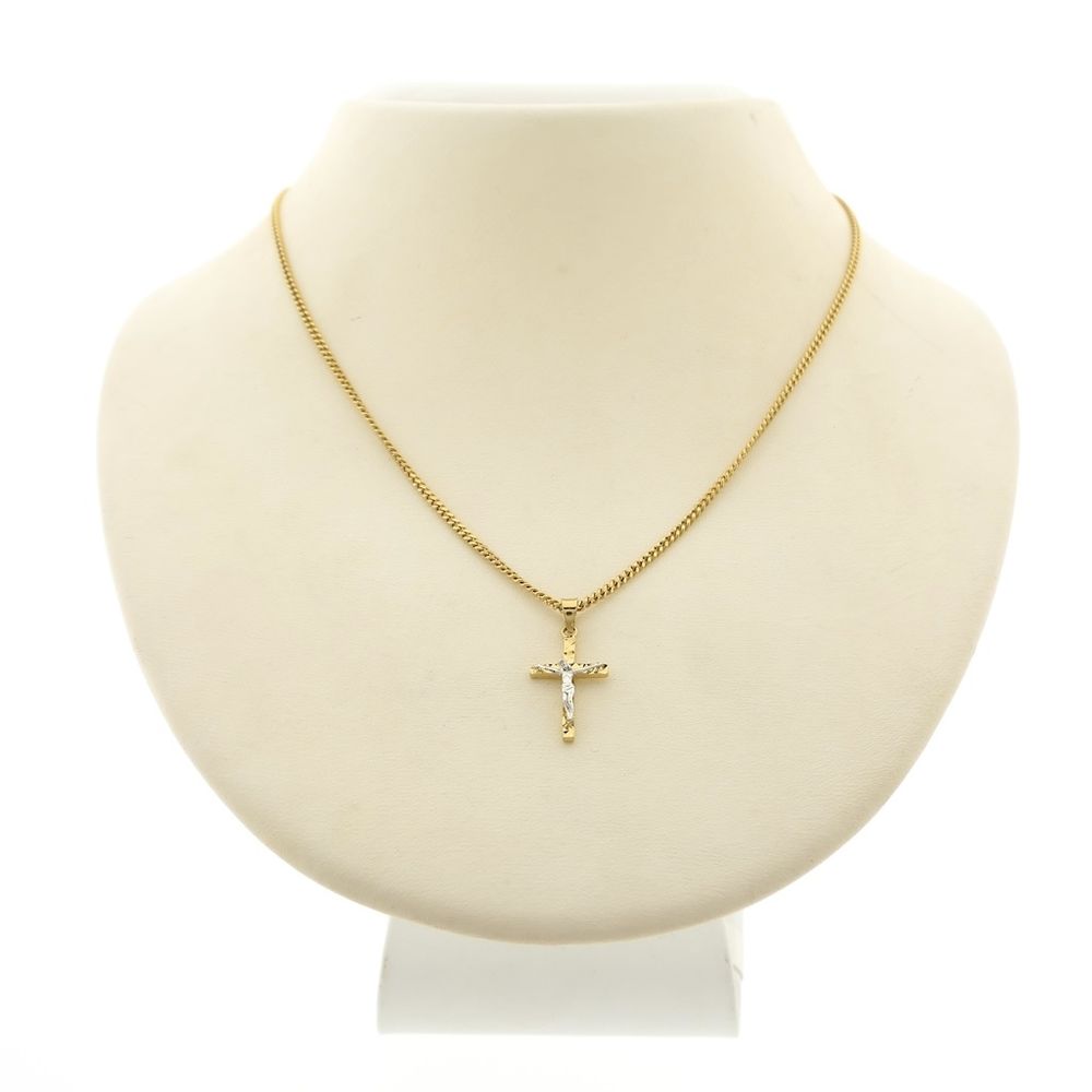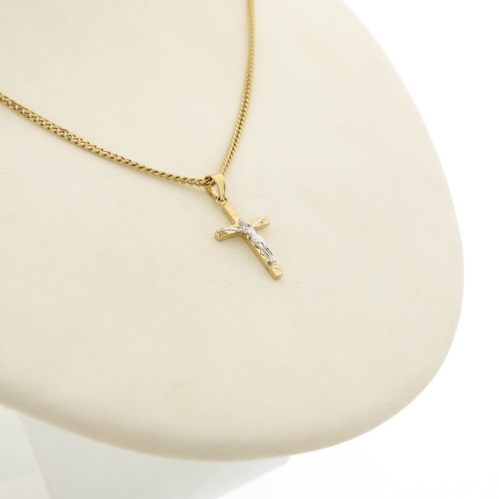 Two-tone gold pendant of a cross of Christ with a white gold corpus. This piece is beautifully detailed. It is crafted from 14-karat white and yellow gold (585/1000).