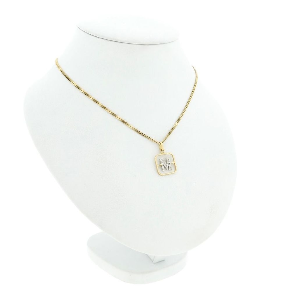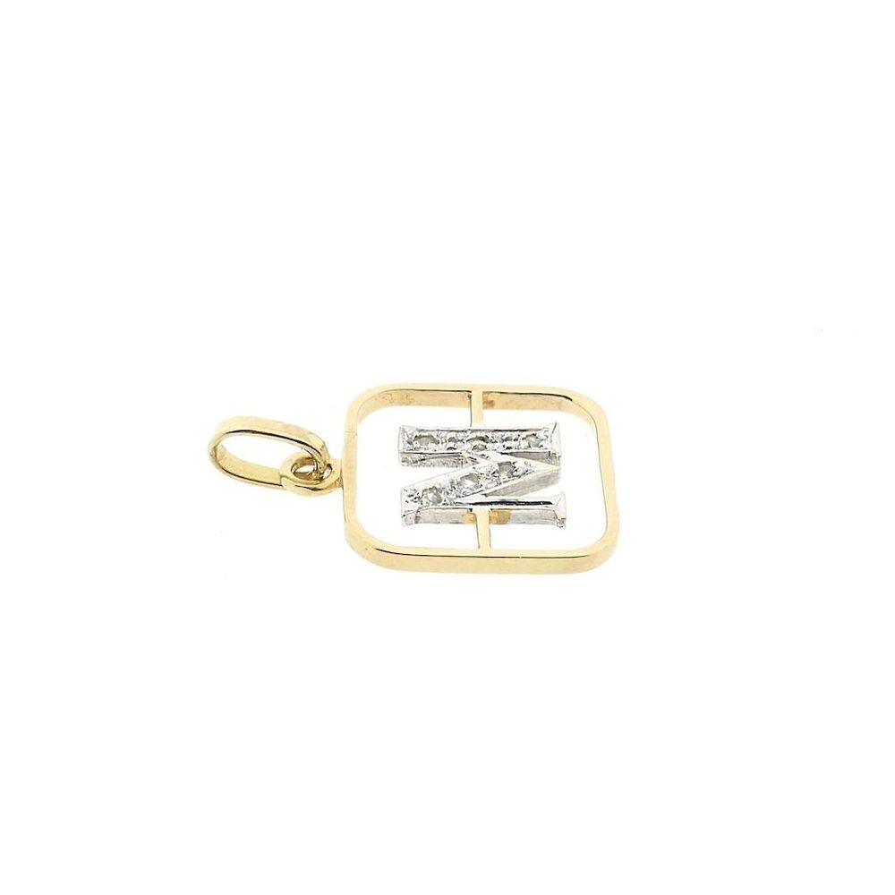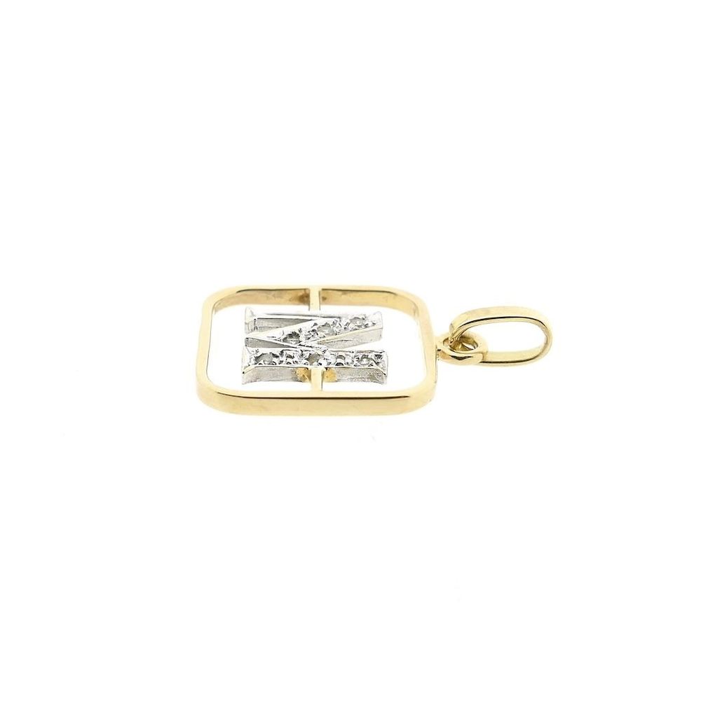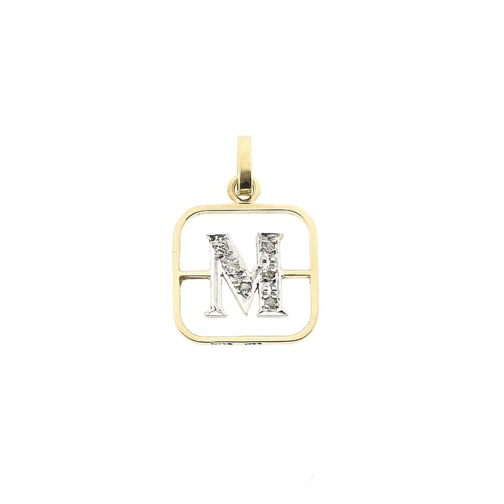 Two-tone gold pendant of the letter M with diamonds; 0.03 ct.