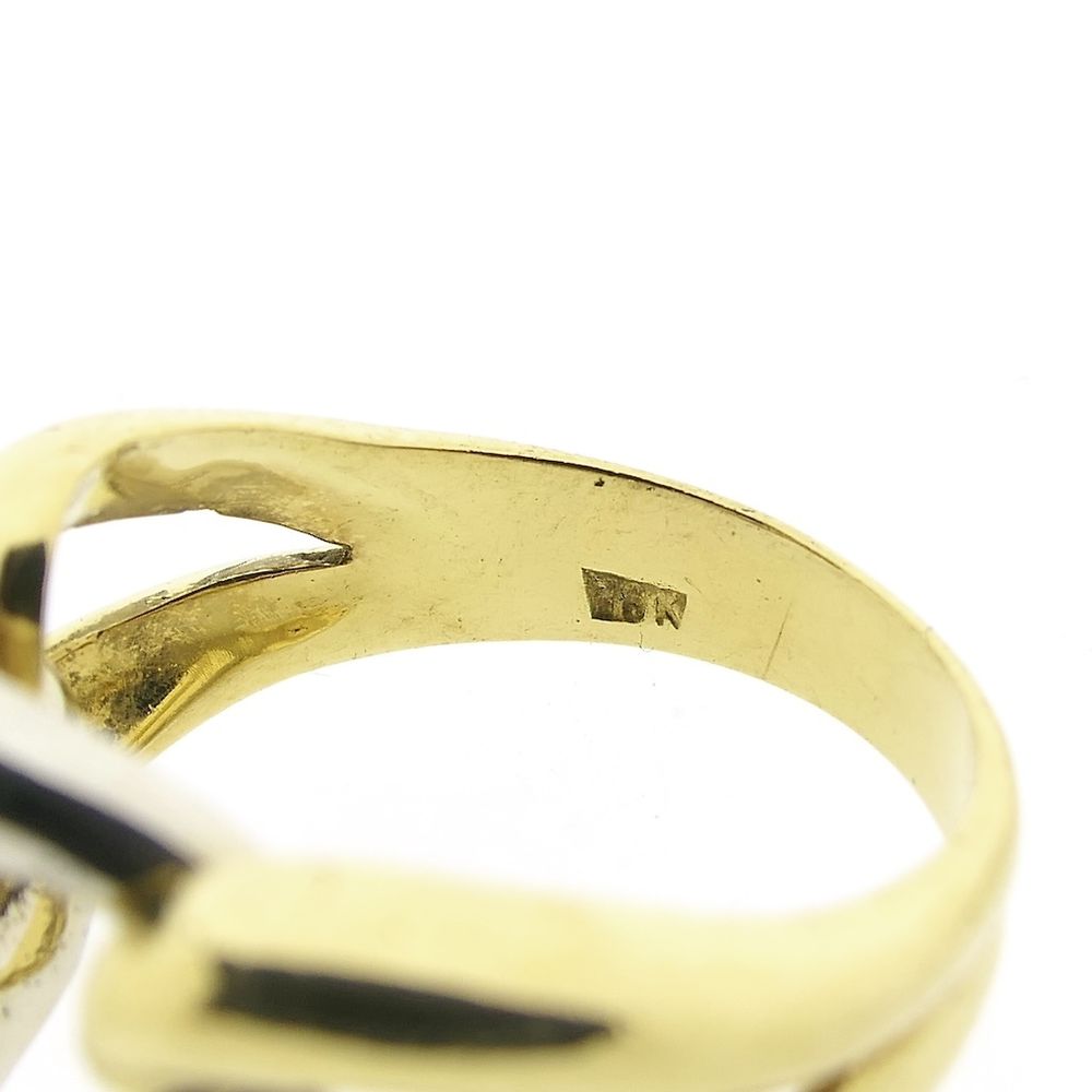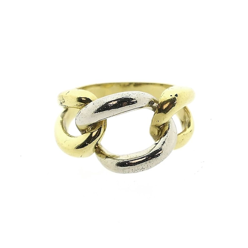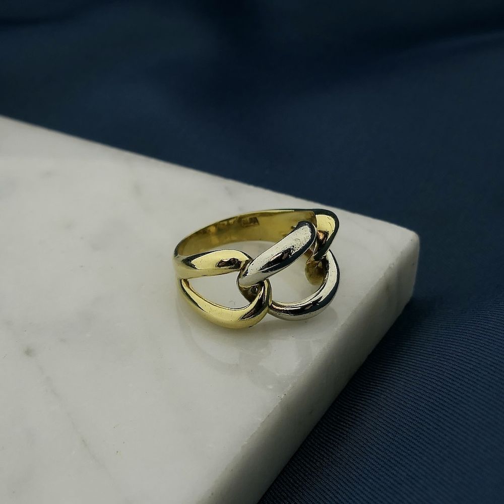 Exclusive white gold ring with a knotted design. This women's ring has a robust and striking appearance and is crafted from 18-karat white and yellow gold (750/1000).