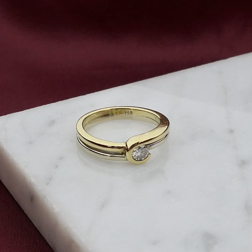 Two-tone gold ring set with a 0.22 ct natural diamond. A classic and elegant piece. The ring is crafted from 18-karat white and yellow gold (750/1000).