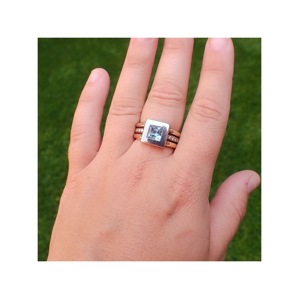 Two-tone gold ring with topaz and diamonds; 0.12 ct.