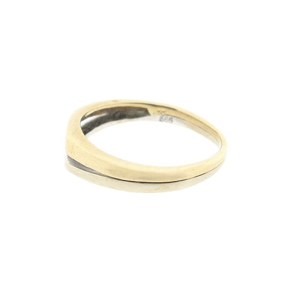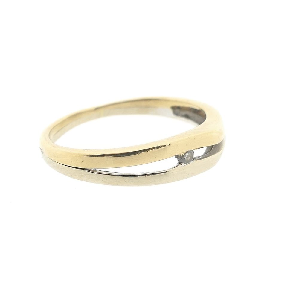 Two-tone gold ring set with a round brilliant-cut zirconia stone. The zirconia is loosely set between a white gold and yellow gold section. The ring has a subtle and sleek look and is crafted from 14-karat white and yellow gold (585/1000).