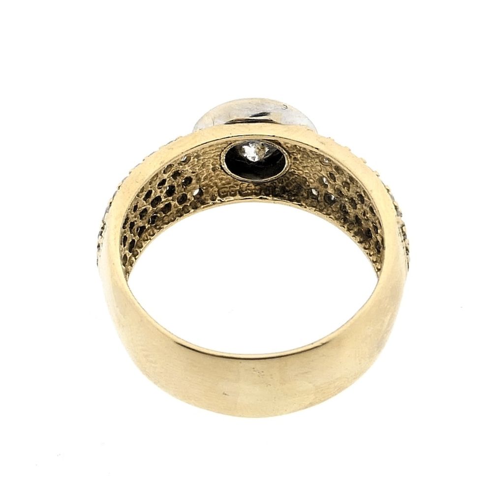 Gold ring pavé-set with round brilliant-cut zirconia stones, with a 6.5 mm zirconia stone in the center set in white gold. The ring is crafted from 14-karat yellow gold (585/1000).