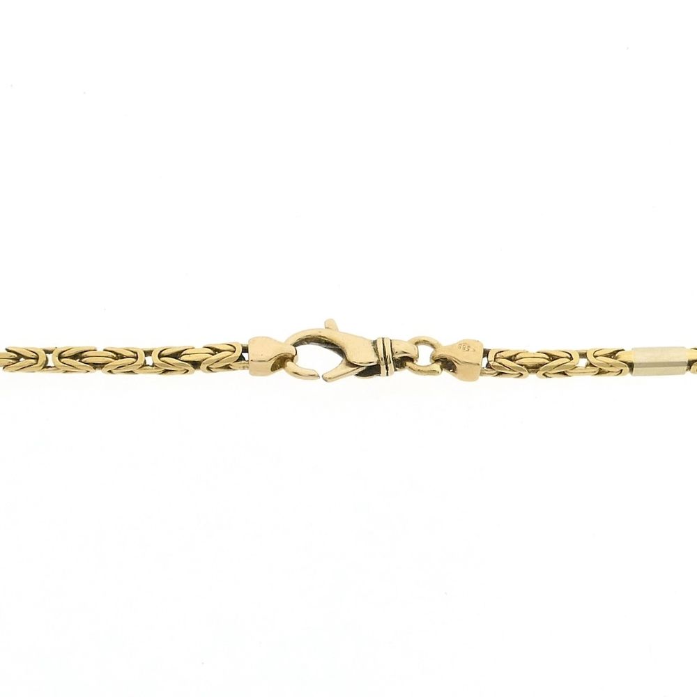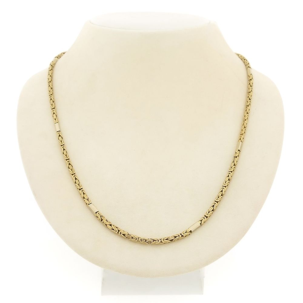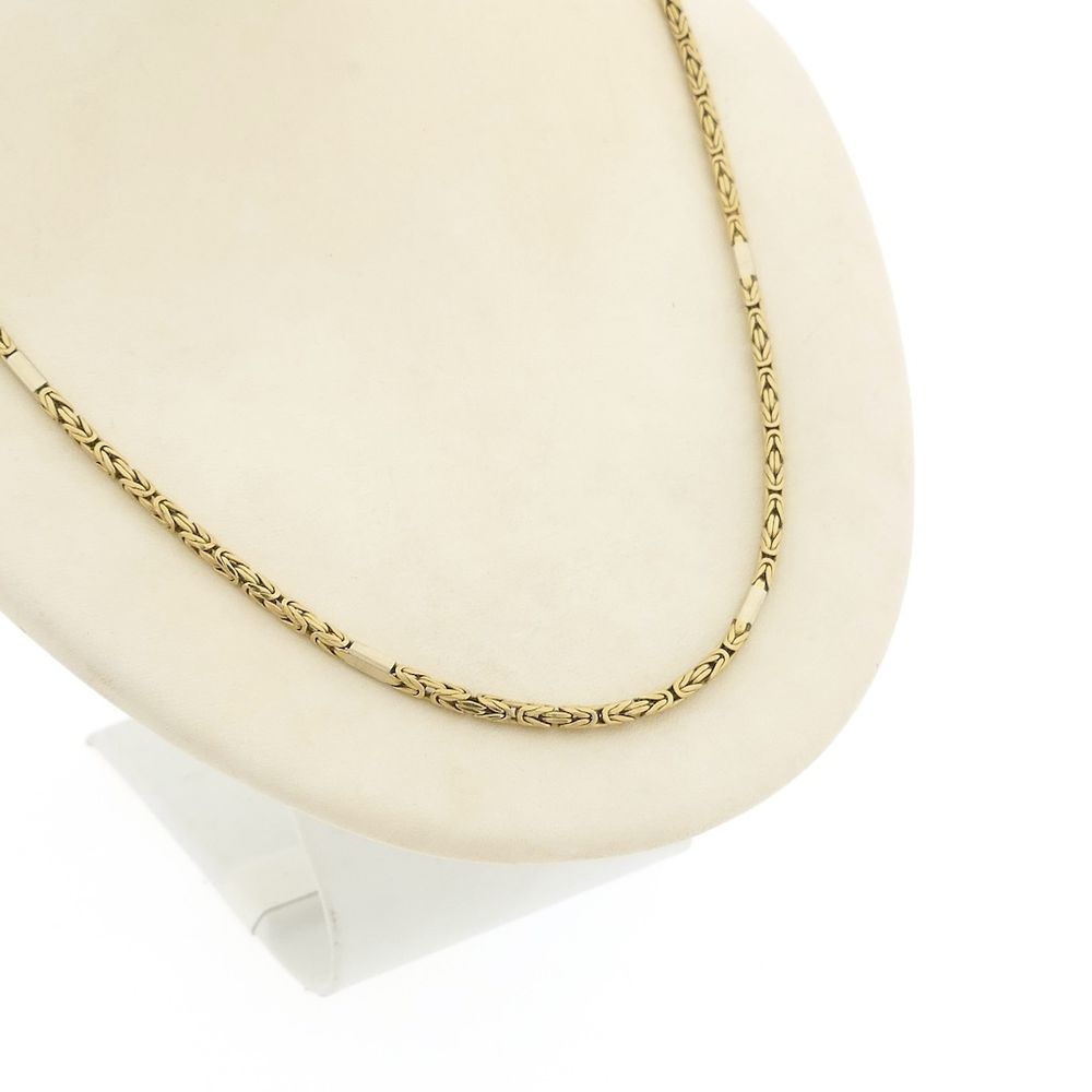 A two-tone gold king's chain, also known as a Byzantine link. A beautifully detailed link that's centuries old! The chain is made with solid square links and has a smooth finish, while the white gold links are closed. The piece is crafted from 14-karat white and yellow gold (585/1000).