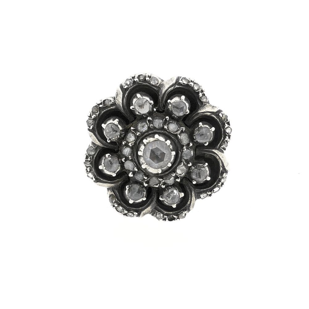 Antique gold ring set with a cluster of rose-cut diamonds. The diamonds are set in silver, making them sparkle even more beautifully. A beautiful and classic piece from the Victorian era. The ring is crafted from 14-karat yellow gold (585/1000) and second-grade silver (835/1000).