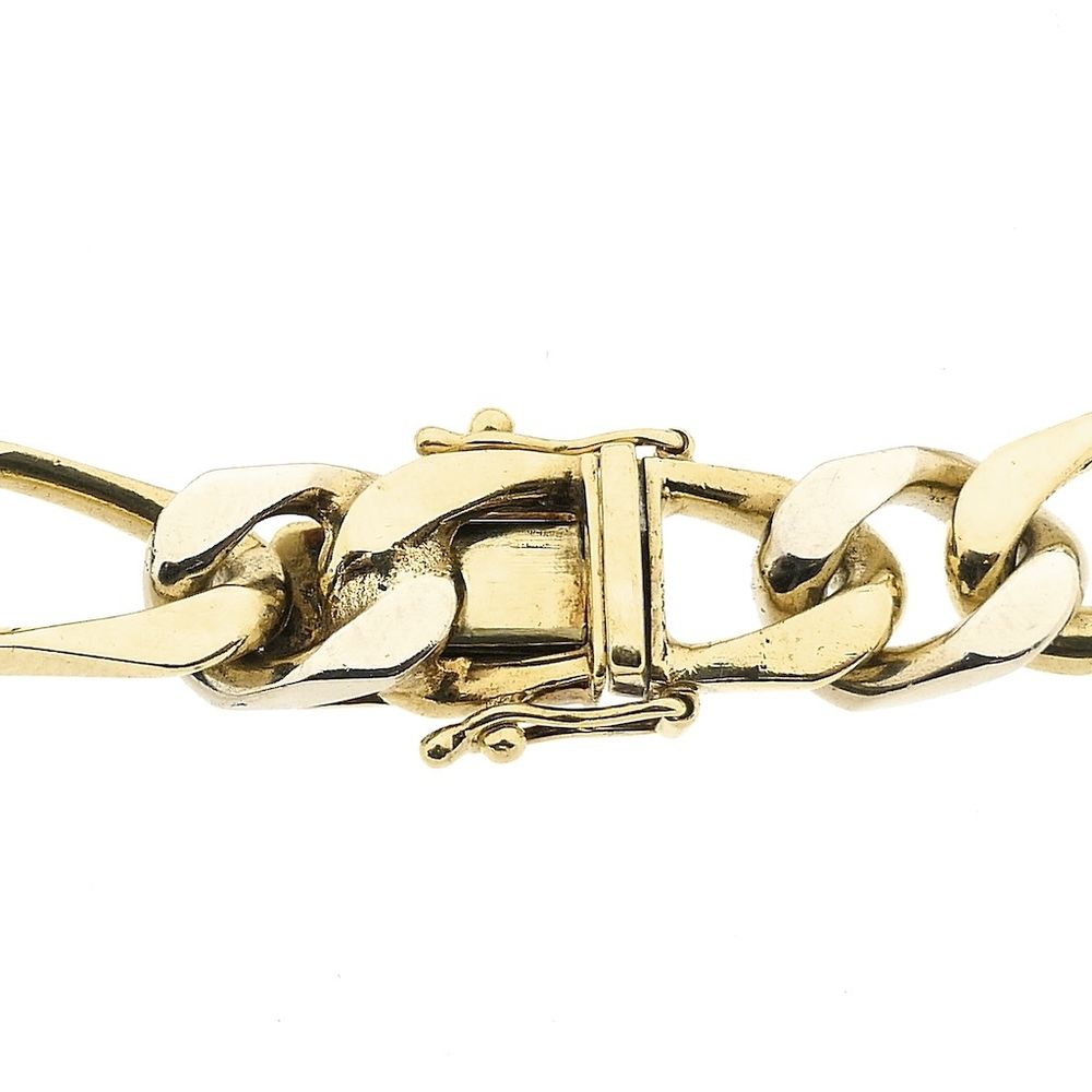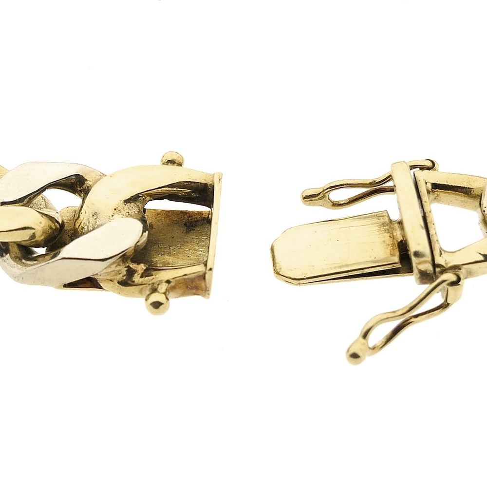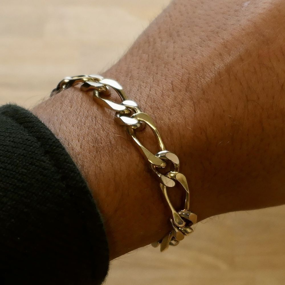 Two-tone gold wide gourmet link bracelet. The bracelet has a smooth finish. It's a supple piece of jewelry with a robust and luxurious appearance. The bracelet is crafted from 14-karat white and yellow gold (585/1000).