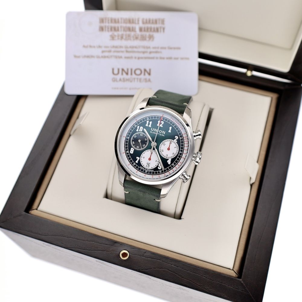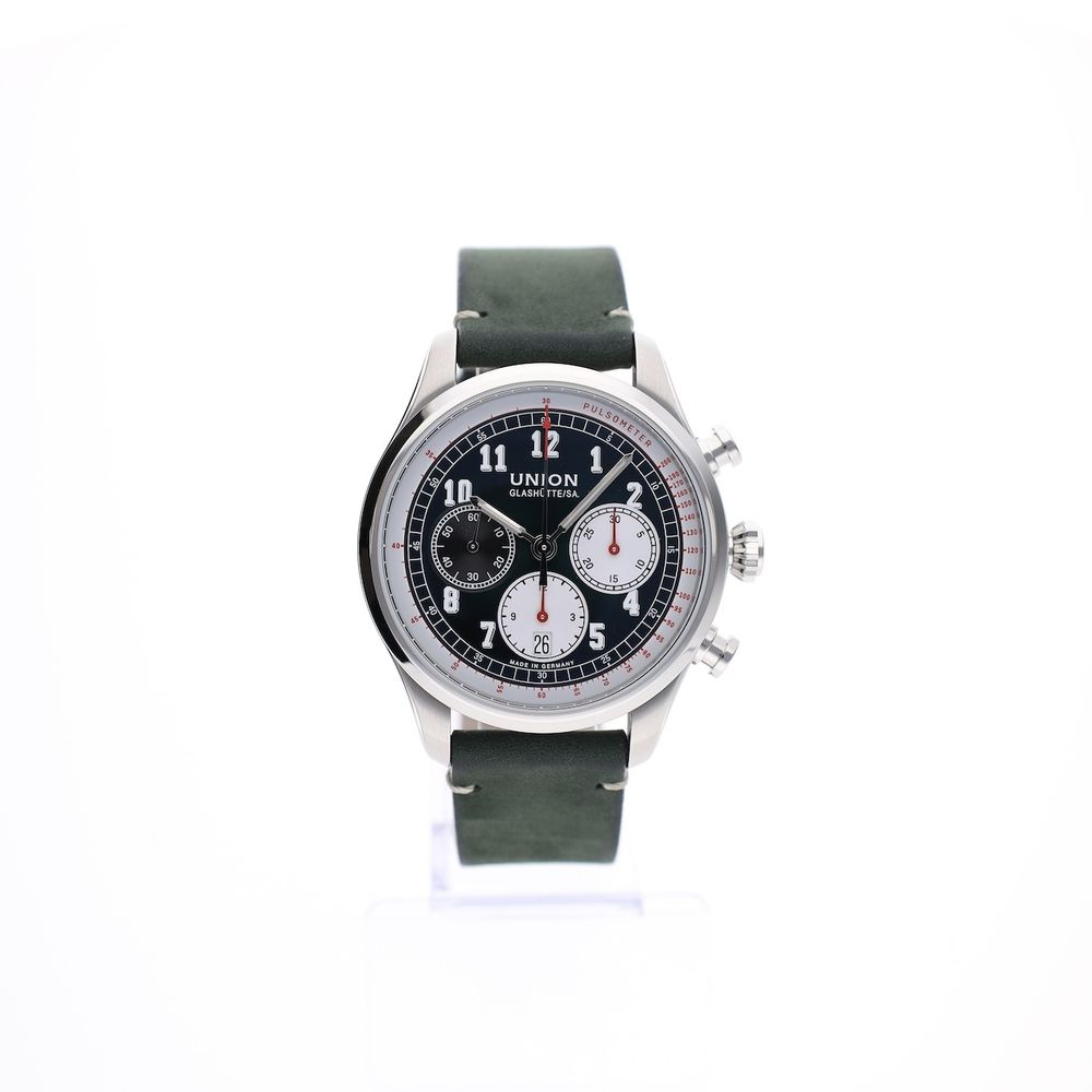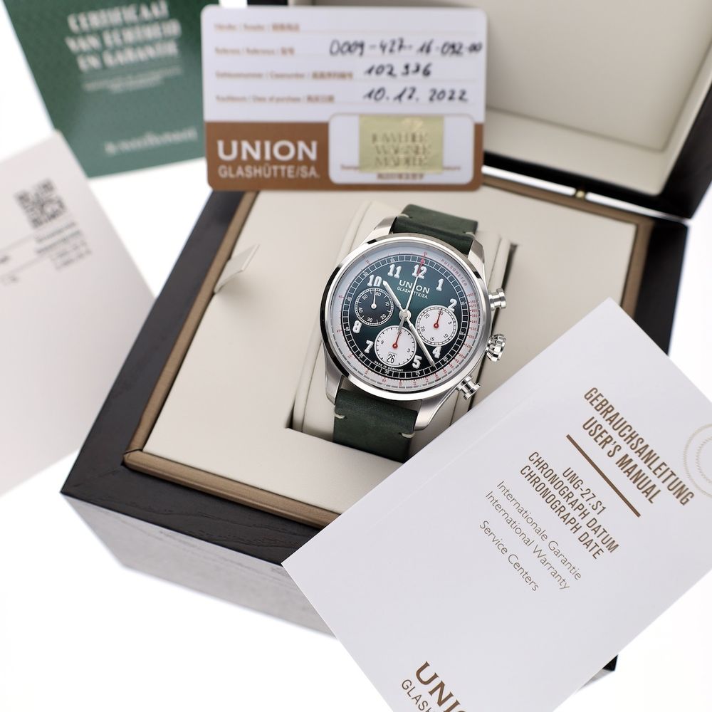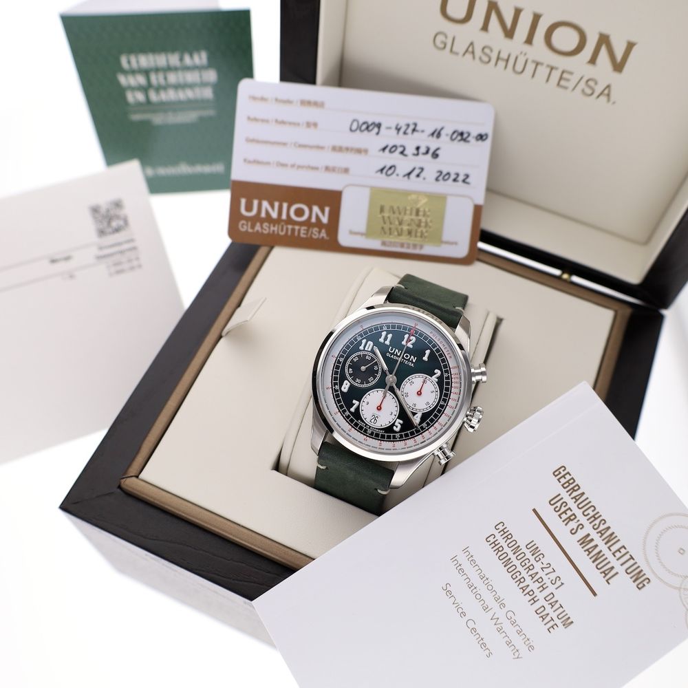 German top quality from world-famous Glashütte! This Union Glashütte Belisar. A classic design meets ultimate German precision. The Union Glashütte Belisar Chronograph is a sporty chronograph watch with a stylish look. Designed and produced in the watchmaking town of Glashütte, this model represents reliability, technology, and craftsmanship in its purest form. Union is a traditional watch manufacturer from Glashütte with a 128-year history in high-end watchmaking. They specialize in manufacturing and offer excellent value for money. This watch is in top (new) condition, full-set from 12-2022, with a beautiful head cut off. The current retail price is €2950. This attractive watch is equipped with a particularly high-quality Swiss Made automatic movement Cal. UNG-27.S1, which runs perfectly and very accurately with an amplitude of 295 degrees and deviation within the strict chronometer standards. The movement boasts a long 65-hour power reserve, a Si balance spring, and top-notch specifications. The movement is clearly visible through the transparent sapphire crystal caseback. A beautiful example of top-notch craftsmanship from Glashütte, Germany's premier watchmaking center. The green strap is also in mint condition and perfectly complements the dial and watch. The strap fits wrists up to approximately 21cm and features a luxurious Union Glashute folding clasp. This watch comes with the original box, outer box, original warranty card, manual, date-setting tool, and our in-house warranty report with a 1-year warranty.