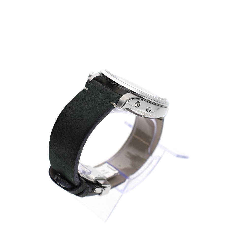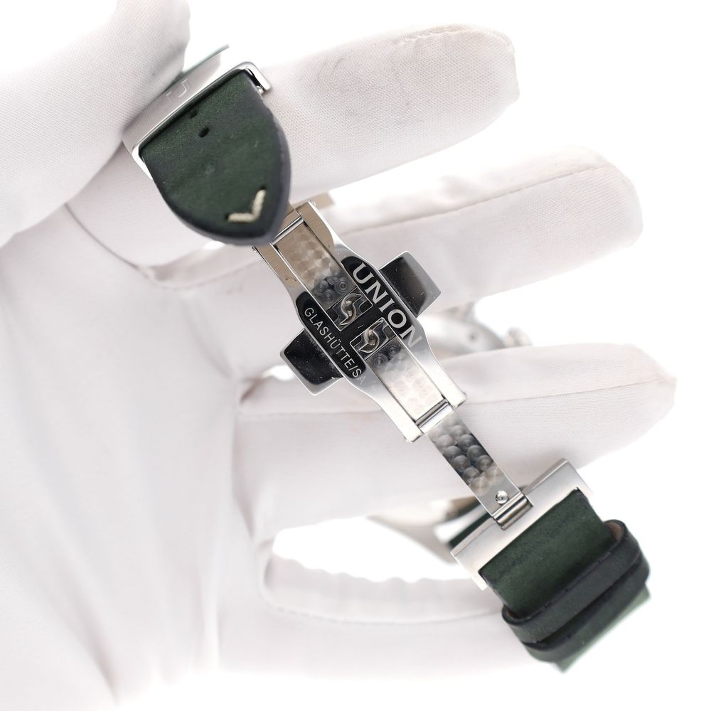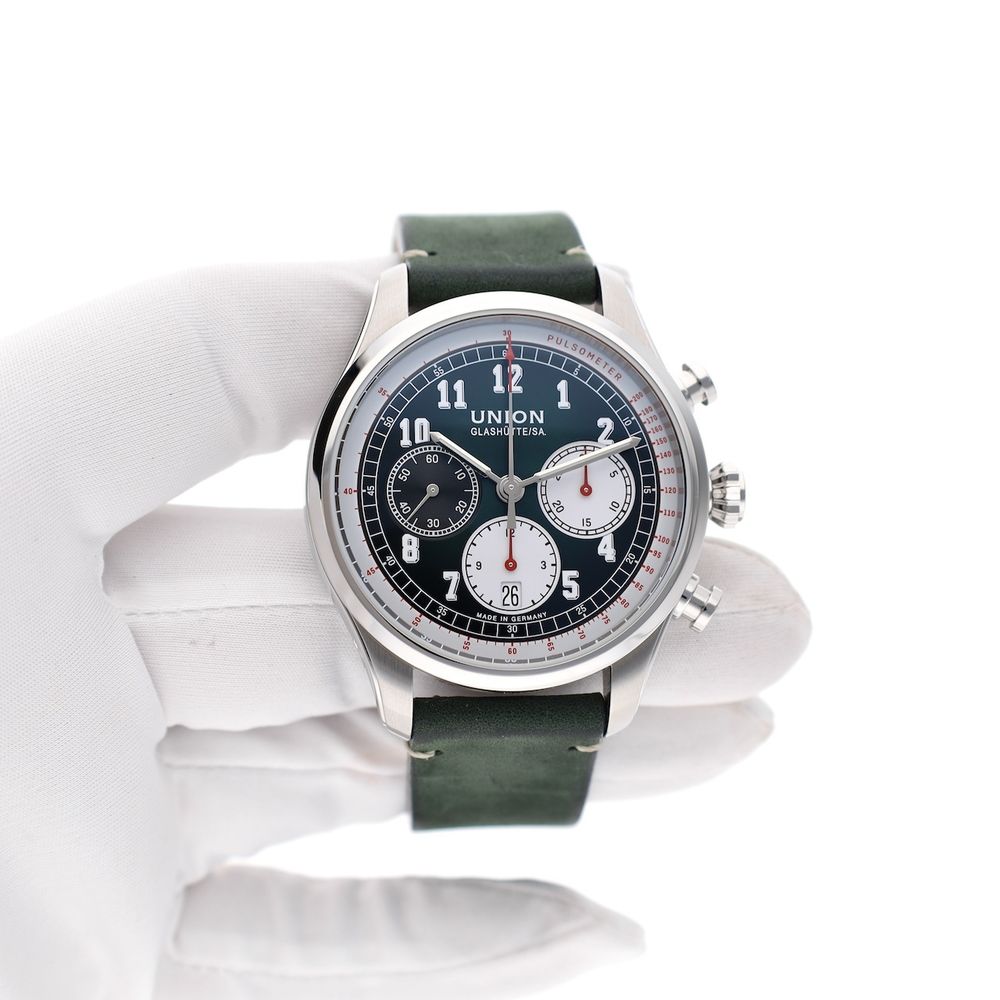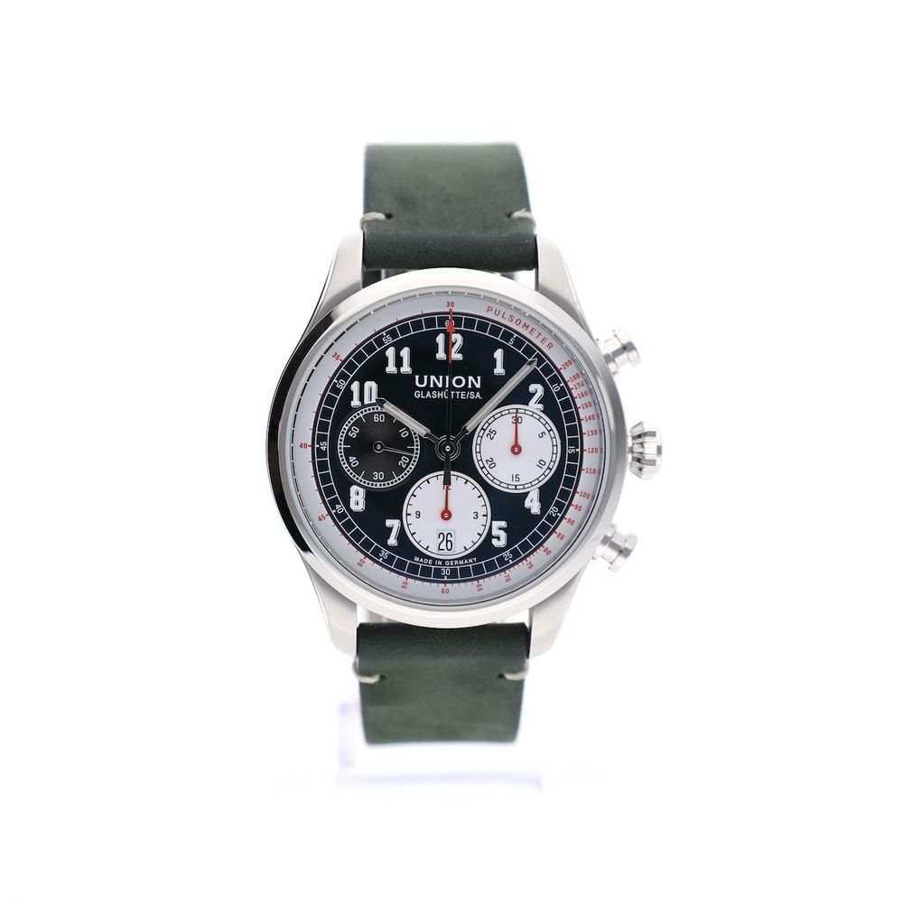German top quality from world-famous Glashütte! This Union Glashütte Belisar. A classic design meets ultimate German precision. The Union Glashütte Belisar Chronograph is a sporty chronograph watch with a stylish look. Designed and produced in the watchmaking town of Glashütte, this model represents reliability, technology, and craftsmanship in its purest form. Union is a traditional watch manufacturer from Glashütte with a 128-year history in high-end watchmaking. They specialize in manufacturing and offer excellent value for money. This watch is in top (new) condition, full-set from 12-2022, with a beautiful head cut off. The current retail price is €2950. This attractive watch is equipped with a particularly high-quality Swiss Made automatic movement Cal. UNG-27.S1, which runs perfectly and very accurately with an amplitude of 295 degrees and deviation within the strict chronometer standards. The movement boasts a long 65-hour power reserve, a Si balance spring, and top-notch specifications. The movement is clearly visible through the transparent sapphire crystal caseback. A beautiful example of top-notch craftsmanship from Glashütte, Germany's premier watchmaking center. The green strap is also in mint condition and perfectly complements the dial and watch. The strap fits wrists up to approximately 21cm and features a luxurious Union Glashute folding clasp. This watch comes with the original box, outer box, original warranty card, manual, date-setting tool, and our in-house warranty report with a 1-year warranty.