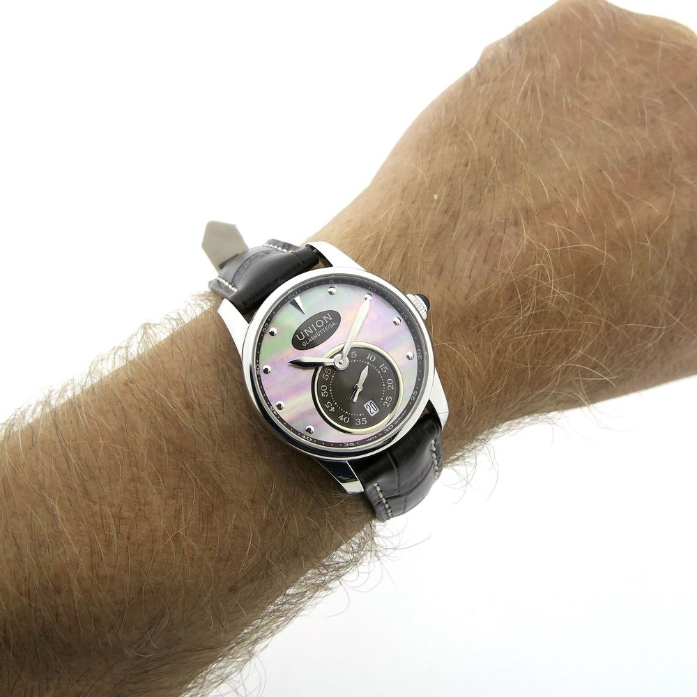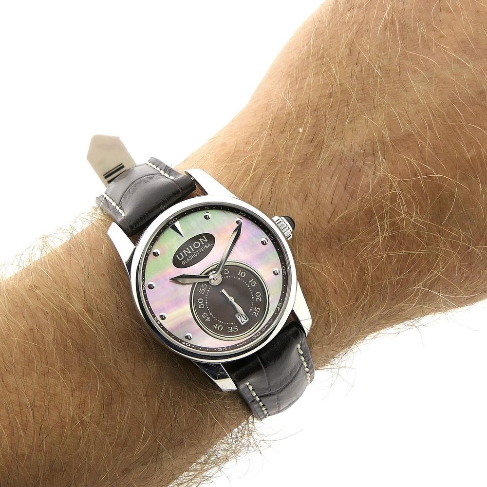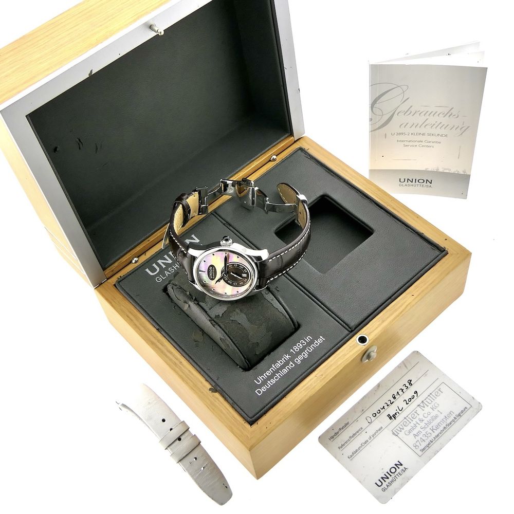 German top quality from world-famous Glashütte! This Union Glashütte Series. A beautiful watch in top condition, full set, with a beautiful head (retail price €2500). With a diameter of 36mm, it was originally a women's watch, but since it wears quite large and I, as a man, find it gorgeous, we can definitely pass it off as a unisex model. The dial is truly uniquely beautiful and of very high quality! We removed the white strap (which is included separately) and fitted a new leather strap (Höppel Germany). The new strap matches perfectly with this dial and watch and also makes it more suitable for men. Of course, we have dozens of straps, models, and colors in stock, so we can always provide something to suit your taste. The Union Series models are characterized by an uncompromisingly elegant style. Striking and strikingly beautiful. These timepieces are the young, fresh face of the German high-end watch industry. This attractive watch is equipped with a particularly high-quality Swiss-made automatic movement, Cal. The U2895-2 runs perfectly and very accurately with an amplitude of 275 degrees and a deviation within the strict chronometer standards. The movement is clearly visible through the transparent sapphire crystal caseback. A beautiful example of top craftsmanship from Germany's premier watchmaking center, Glashütte. Union is a traditional watch manufacturer from Glashütte with a 128-year history in high-end watchmaking. They specialize in affordable watches with an absolute top price-performance ratio. Includes the original box, original warranty card, extra strap, and a 1-year warranty.