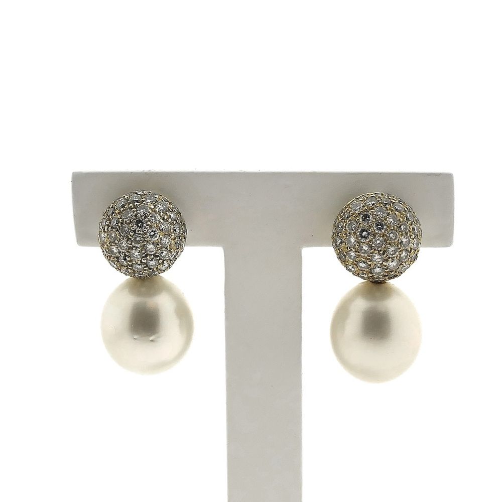 Gold earrings set with diamonds and a large pearl from the luxury brand Utopia. The pearl is 12.0 mm and secured with a screw. The diamonds are pavé-set, white, and weigh approximately 0.77 ct per earring. The diamonds total 1.54 ct. These unique earrings are crafted from 18-karat yellow gold (750/1000).