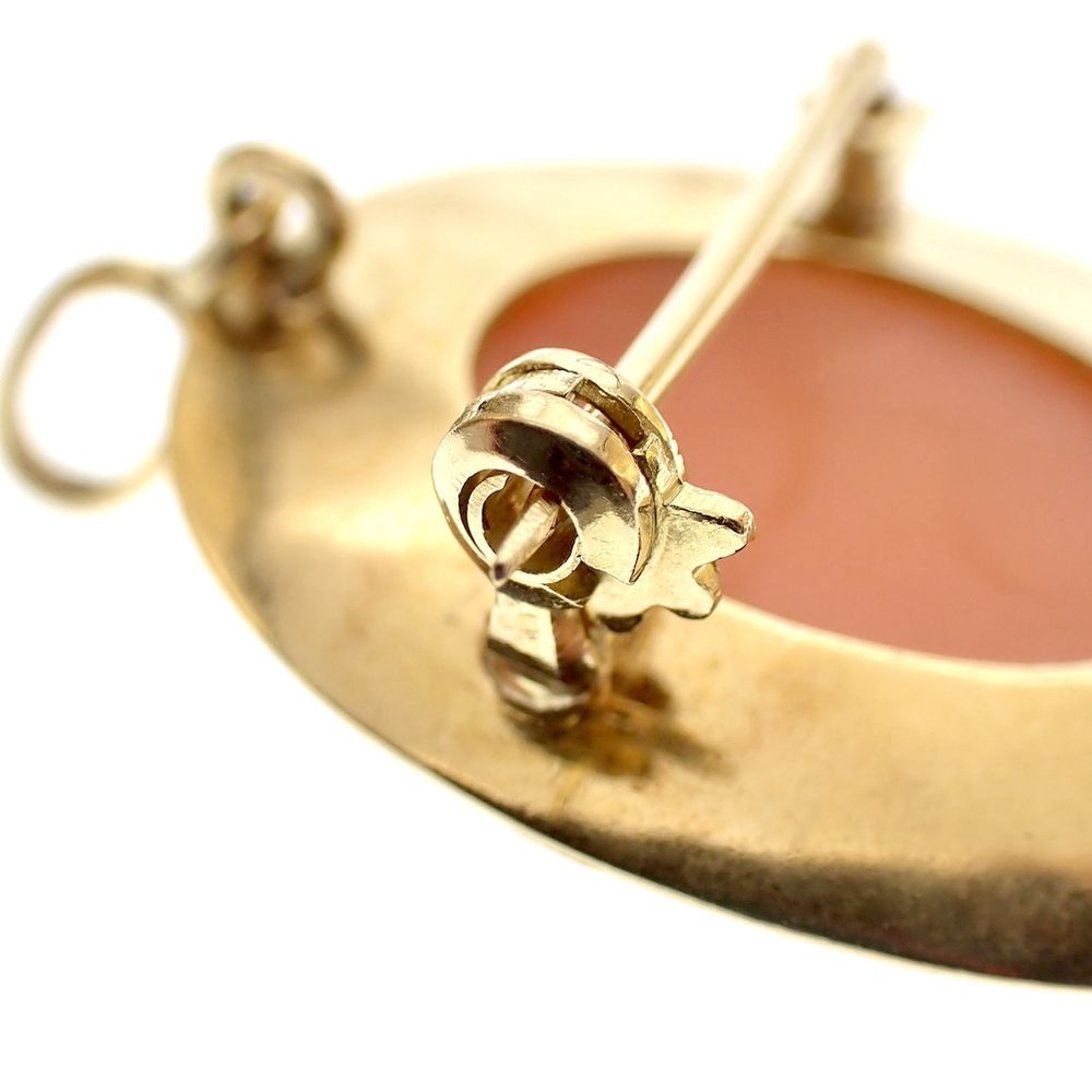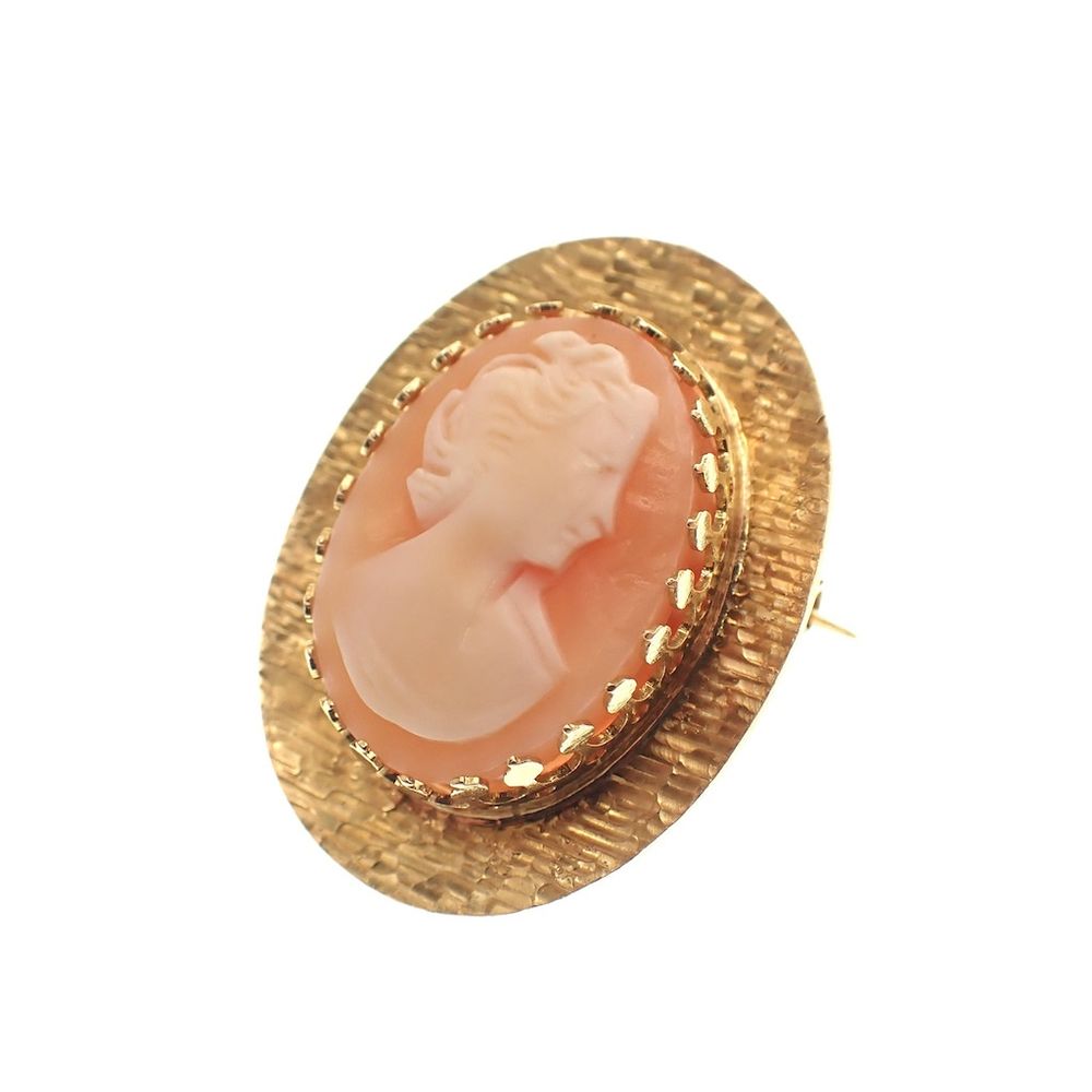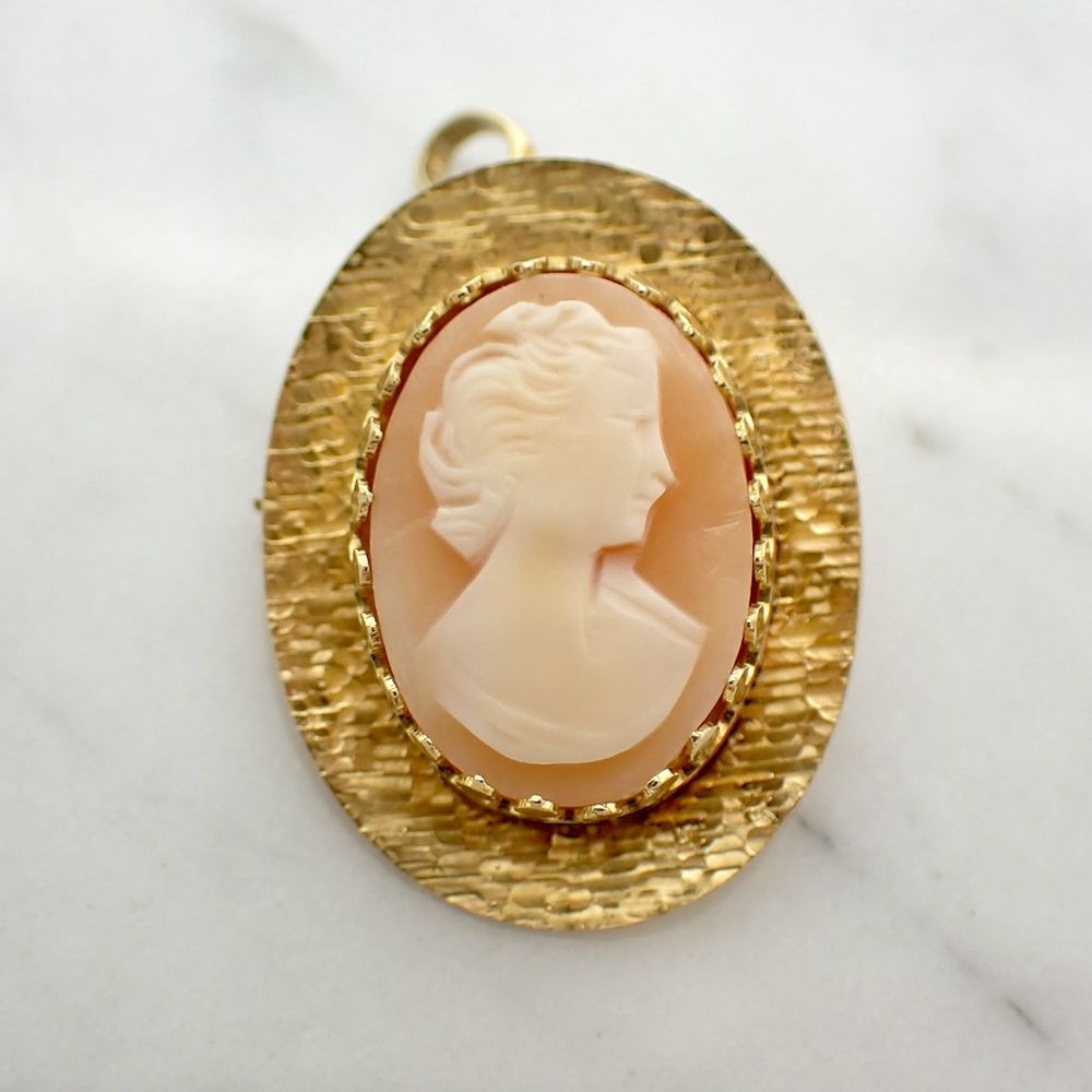 Antique gold brooch/necklace pendant with a cameo. The cameo features a detailed engraving of a woman. The pendant is finished with a gold frame with a unique finish. It is a beautiful antique piece of jewelry. The pendant is crafted from 18-karat yellow gold (750/1000).