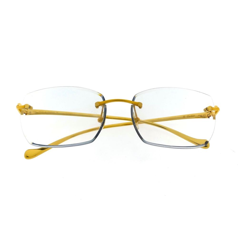 Vintage Cartier glasses with panther decor on the temples (Cartier Panthère line). The lenses are rimless and rectangular in shape. The temples and the bridge between the lenses are gold-colored and made of metal with luxurious finishing. This prescription glasses has the following dimensions:
