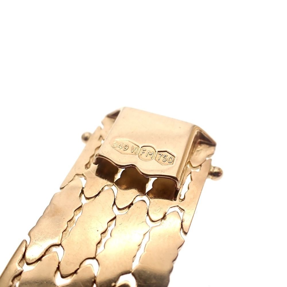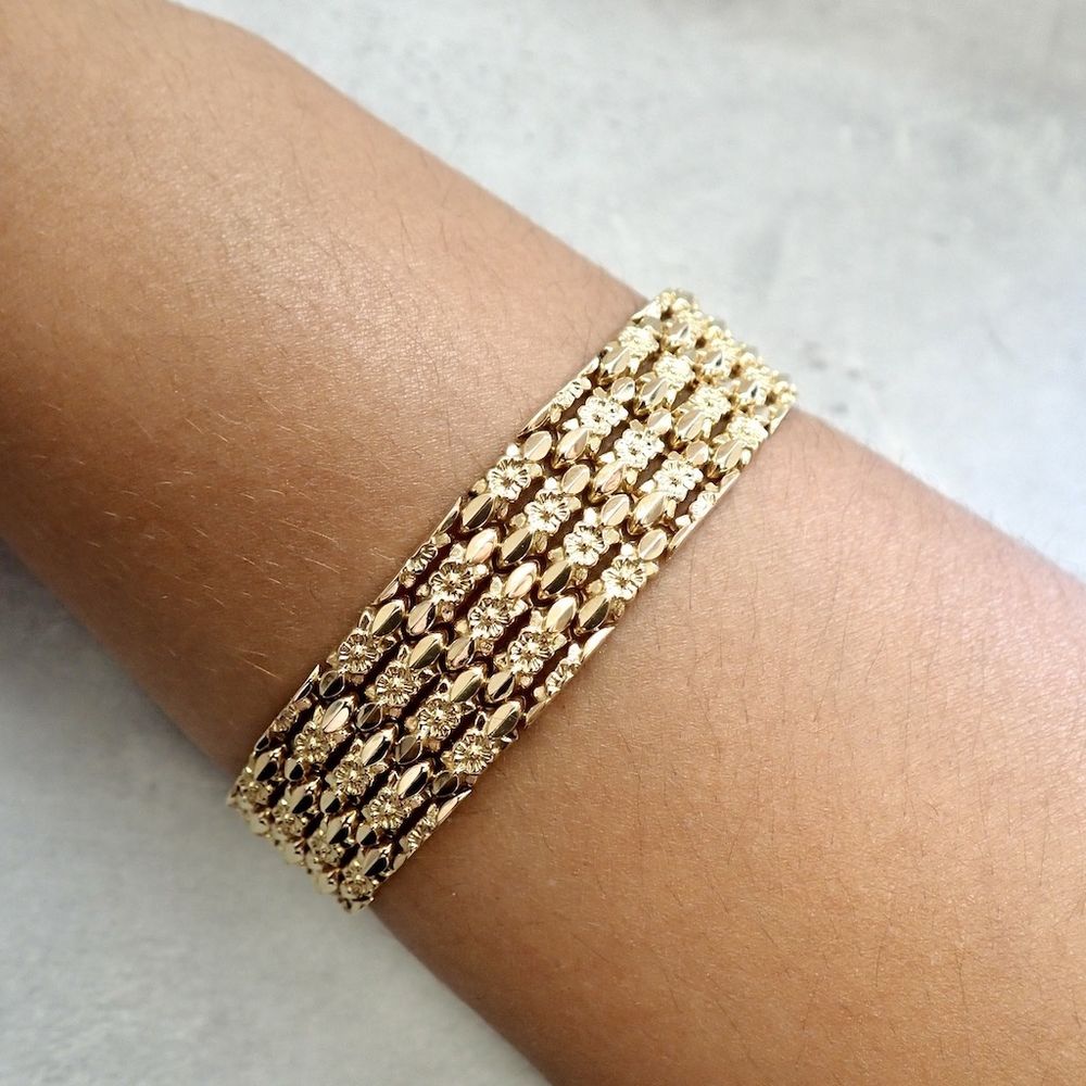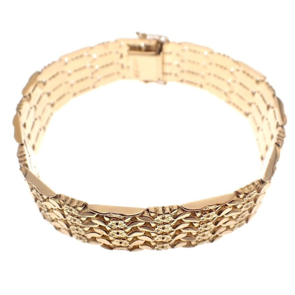 Luxurious gold women's bracelet. The bracelet features a unique link with numerous embossed flowers. It closes with a box clasp and two safety hooks. Crafted from 18-karat yellow gold (750/1000), it is a true gemstone.