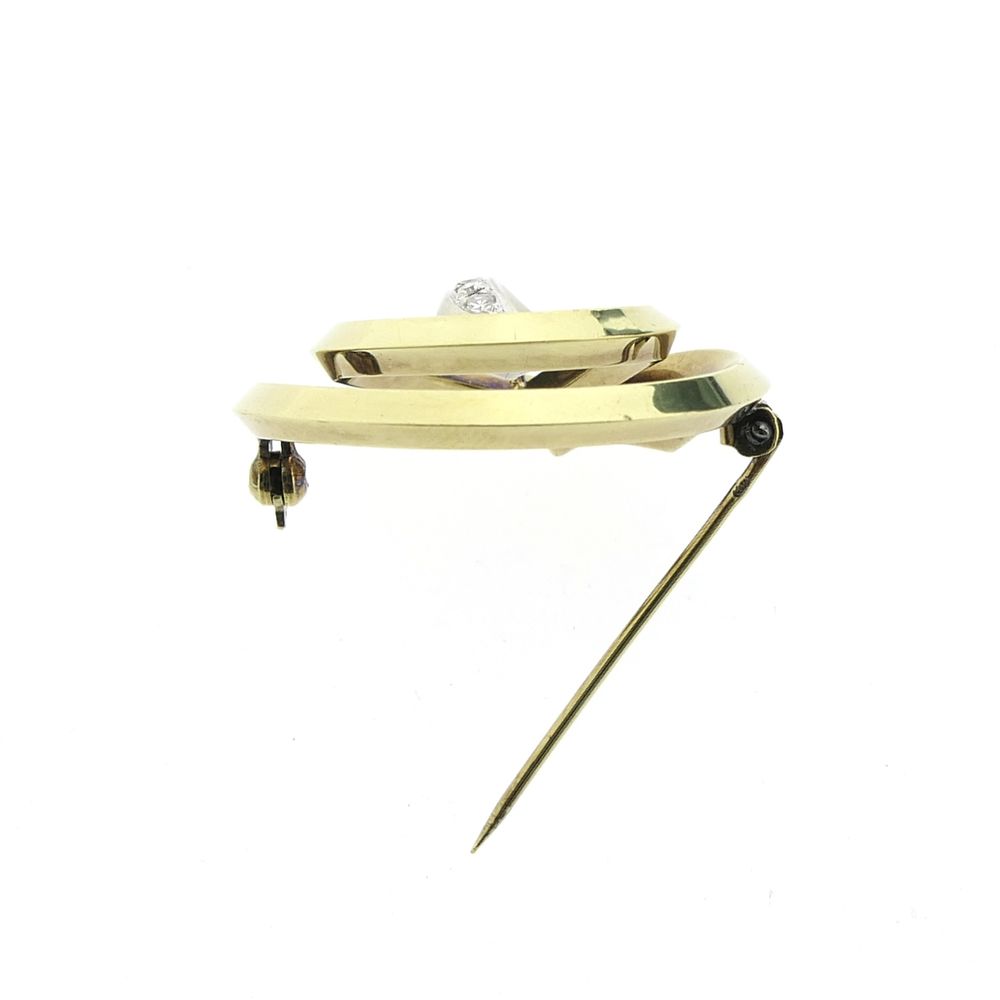 Vintage gold spiral brooch set with four natural diamonds in white gold. This beautiful brooch is crafted from 14-karat yellow gold (585/1000).