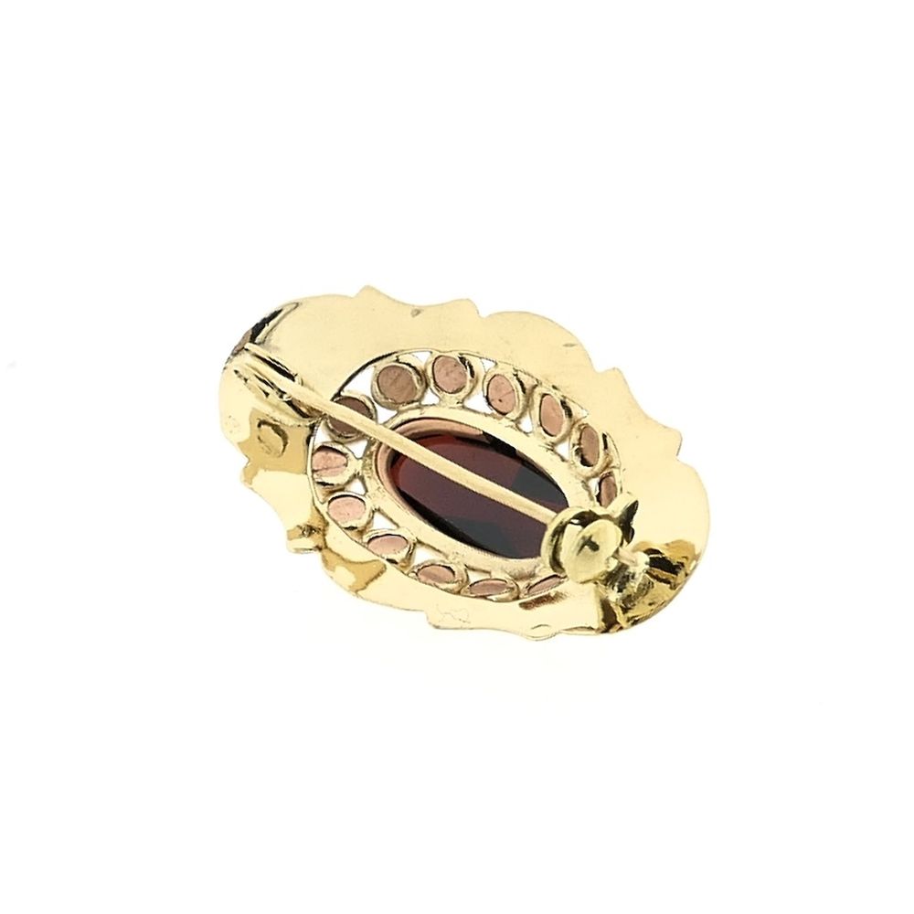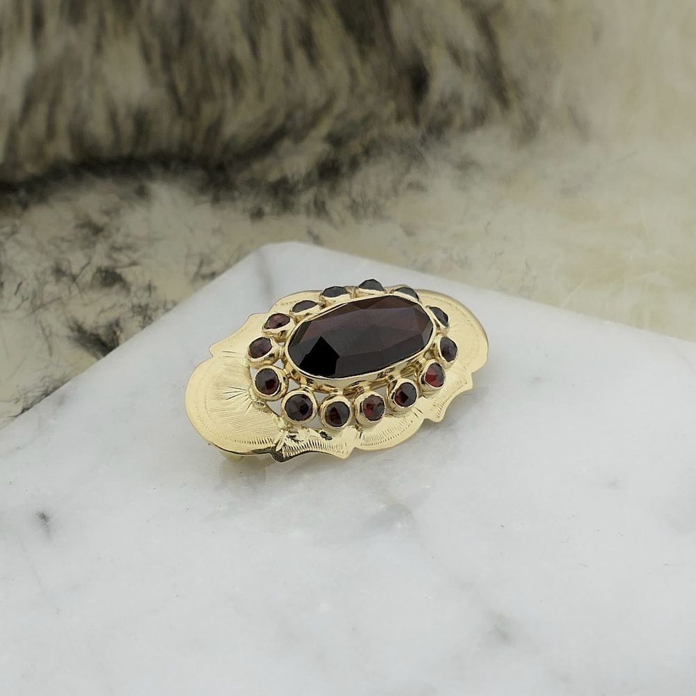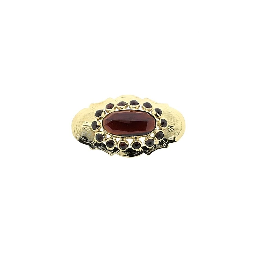 Gold brooch set with an oval faceted garnet stone, surrounded by smaller round faceted garnet stones. The brooch has a vintage look and is crafted from 14-karat yellow gold (585/1000).