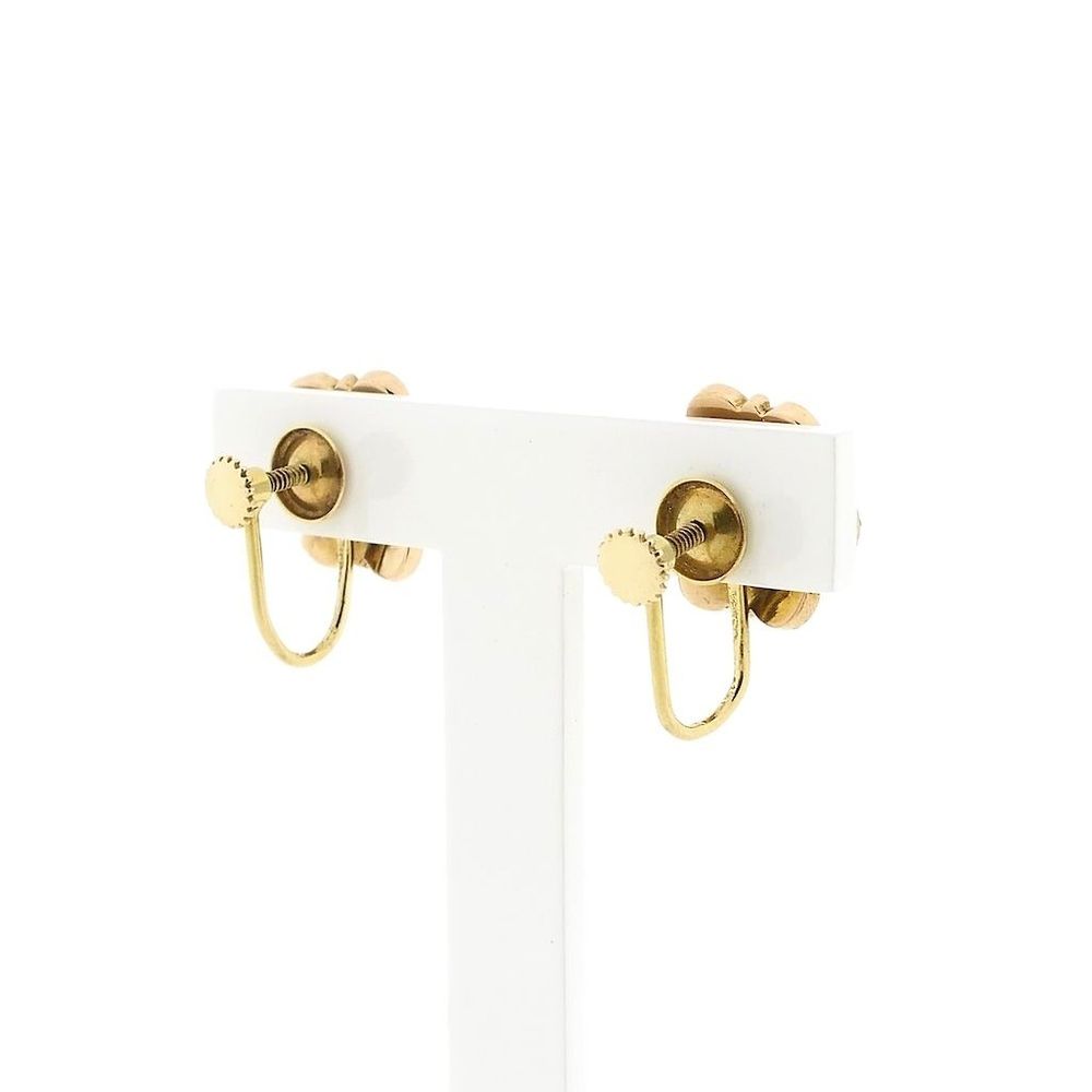 Vintage gold clip-on earrings set with round faceted garnet stones. The earrings close by twisting at the back. This beautiful set is made from 14 karat yellow gold (585/1000).