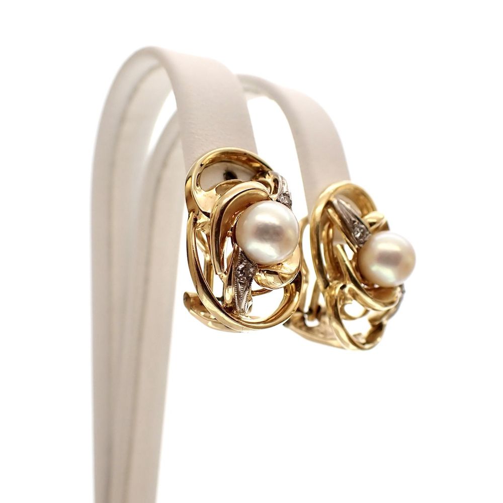 Vintage gold clip-on earrings with pearl and diamonds; 0.08 ct.