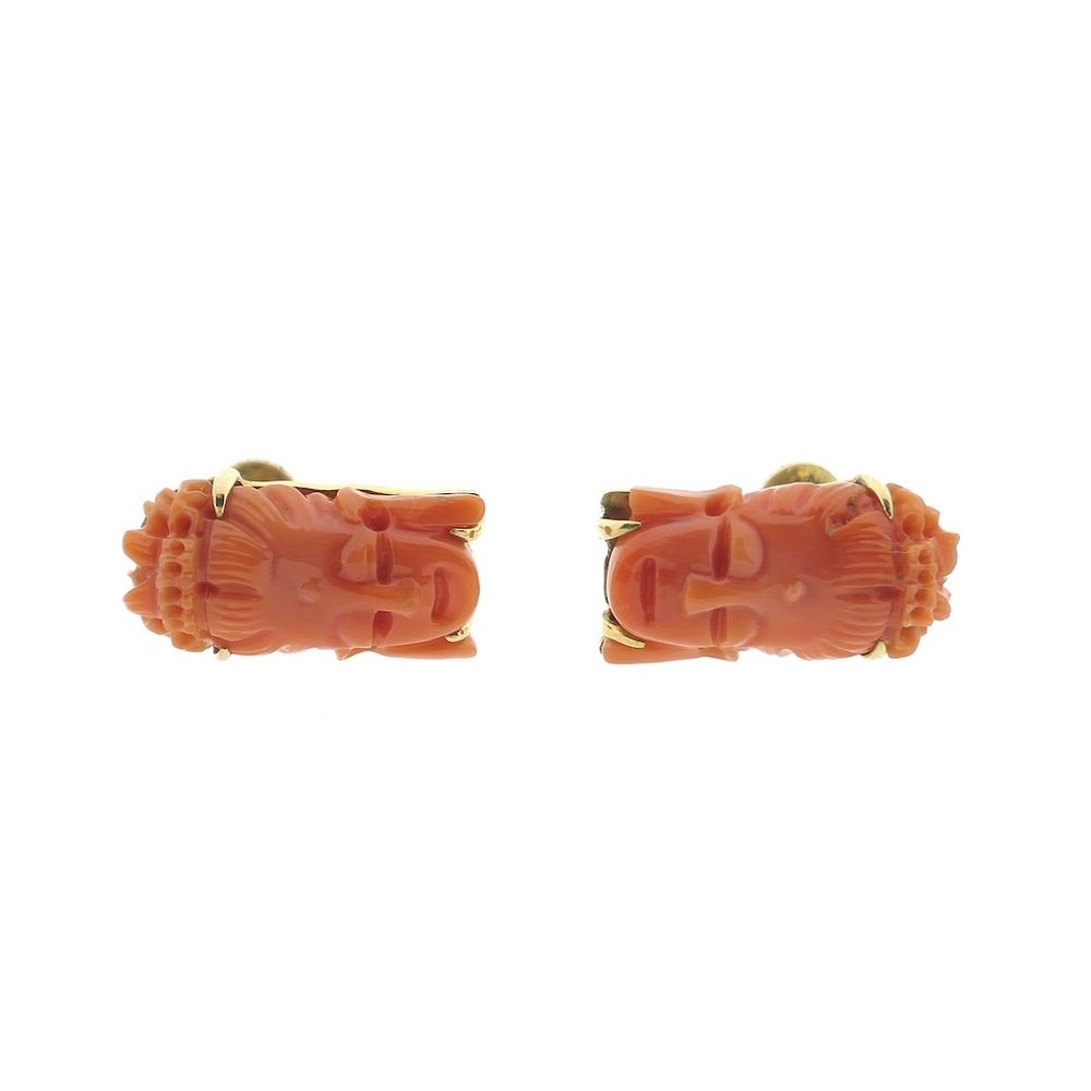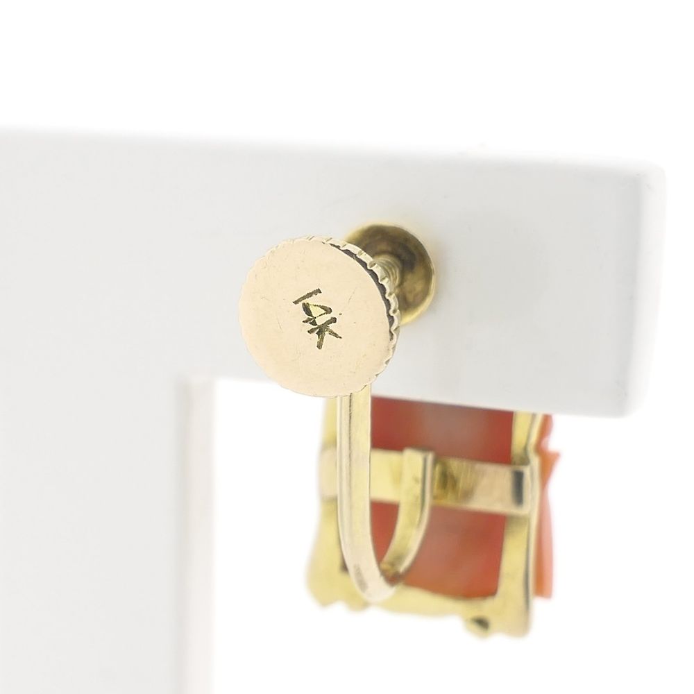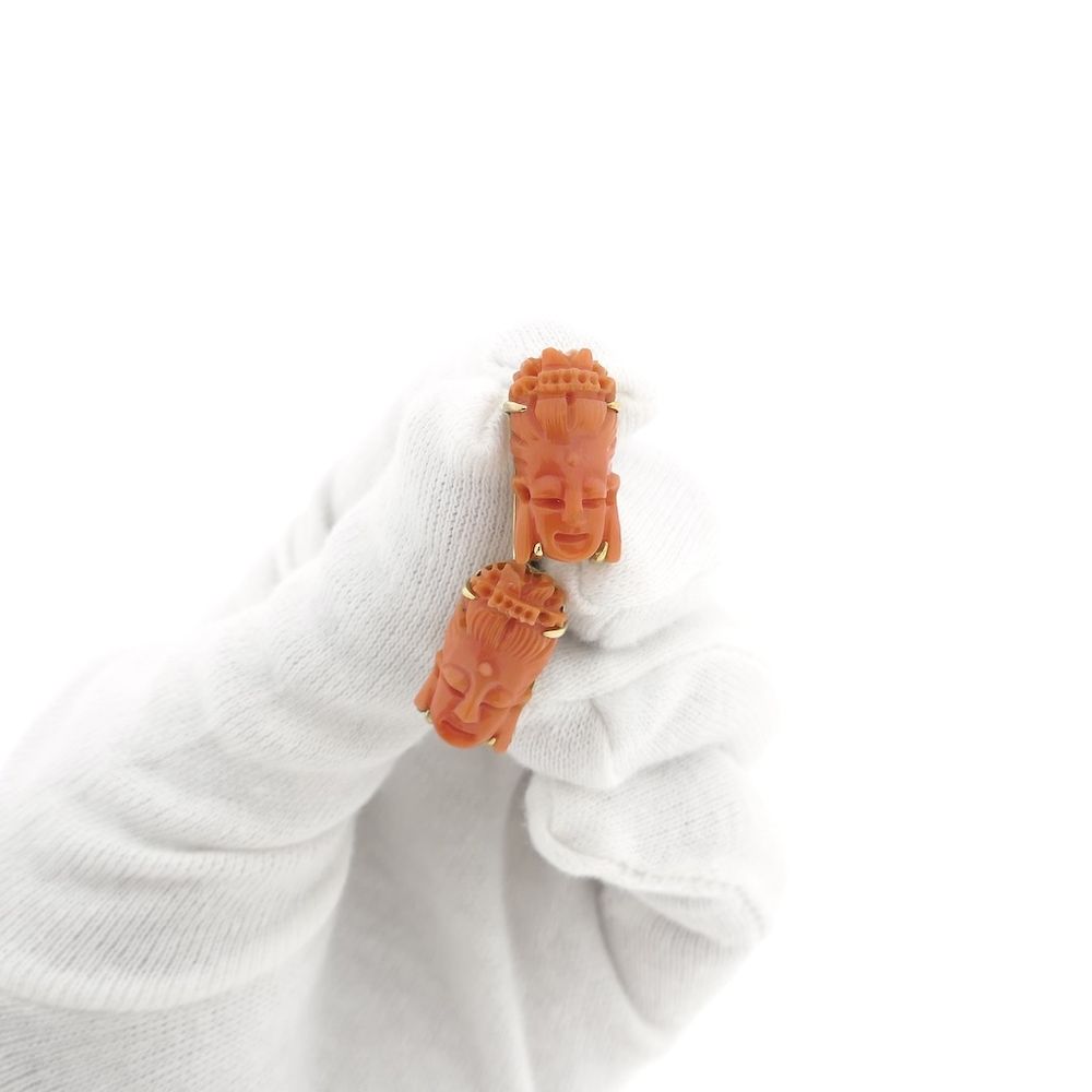 Gold earrings set with carved red corals. The red corals are cut to resemble the face of Kuan Yin. A beautiful vintage pair of earrings crafted from 14-karat yellow gold (585/1000). (Also lovely to wear with the same Kuan Yin ring.) Kuan Yin is an influential figure in both Buddhism and Taoism, particularly in East Asian cultures. She is revered as a bodhisattva, symbolizing compassion and mercy. She is often depicted as a peaceful and comforting feminine presence, helping people in times of pain or need. Her name literally means "she who hears the voices of the world," and many invoke her for support and protection.