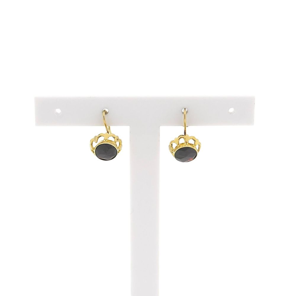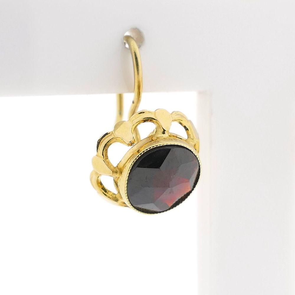 Gold earrings set with a round faceted garnet. A beautiful vintage pair of earrings crafted from 14-karat yellow gold (585/1000).