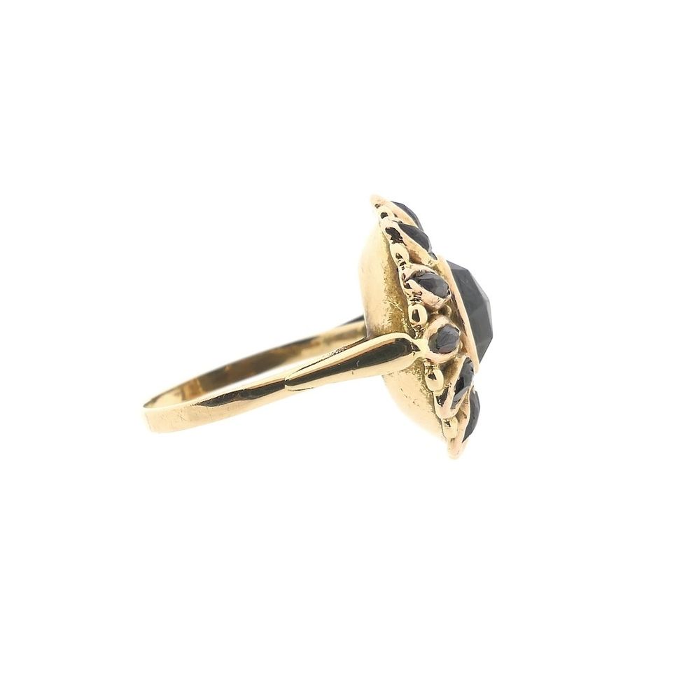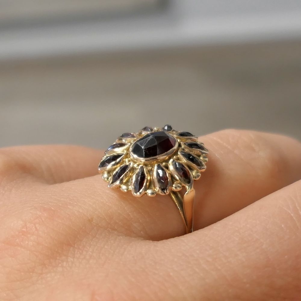 Vintage gold entourage ring set with garnets. The garnets have a beautiful dark wine-red color. The large central stone is oval-cut. Twelve marquise-cut garnets are set around the pendant. The ring has an elegant and floral design. A beautiful vintage women's ring crafted from 14-karat yellow gold (585/1000).