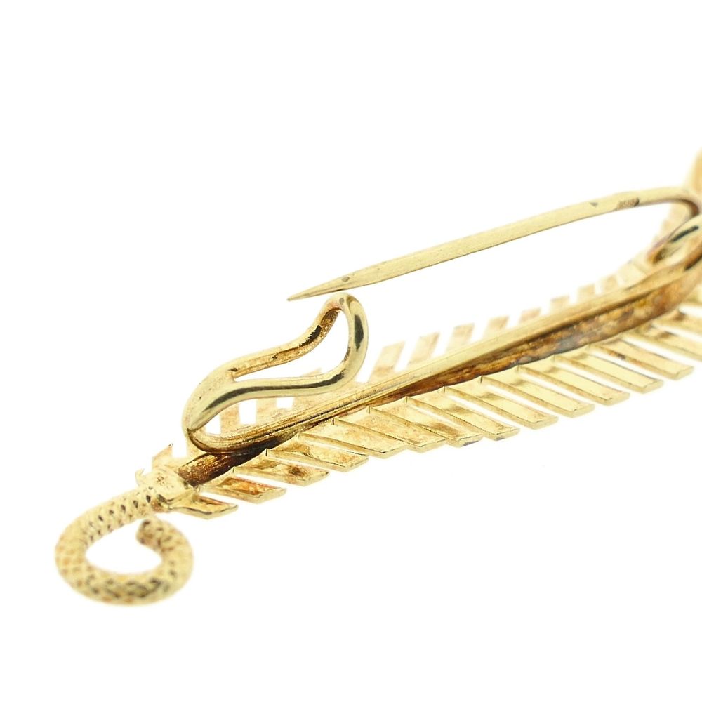 Vintage gold brooch in the shape of a feather. The brooch features detailed finishes, a true classic. This piece is crafted from 14-karat yellow gold (585/1000).