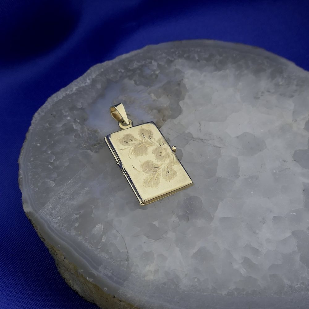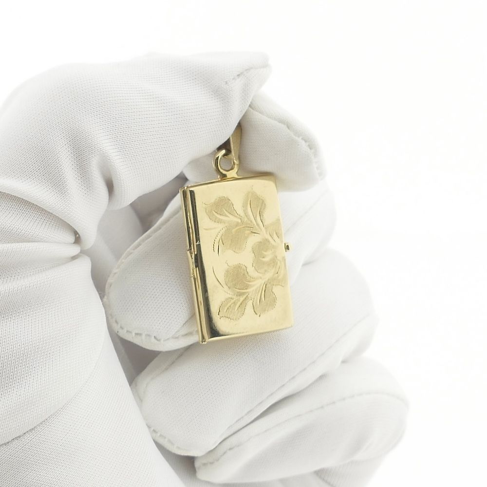 Vintage gold locket pendant with a floral design. The pendant has a polished finish, and the front is textured. The inside is suitable for two photos. You can also keep a small note inside. The locket is crafted from 14-karat yellow gold (585/1000).