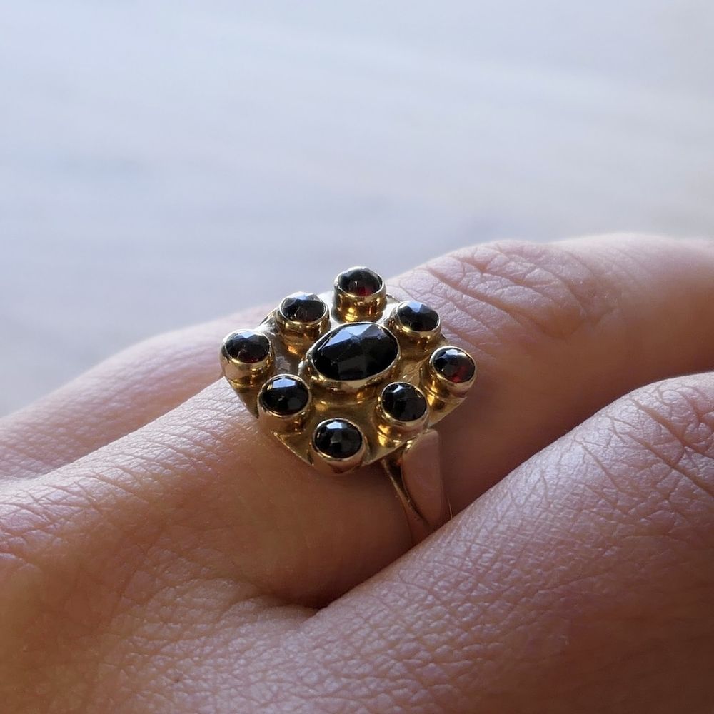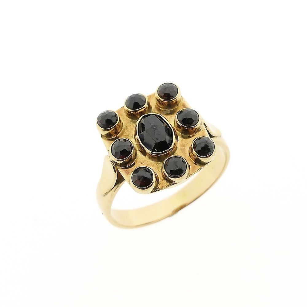 Vintage gold men's ring set with garnet stones. The garnet stones have a beautiful dark wine-red color. This stunning ring is crafted from 14-karat yellow gold (585/1000).