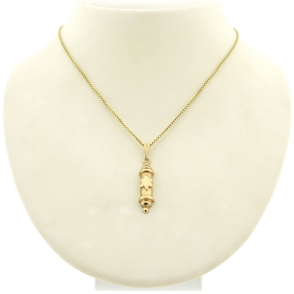 Gold mezuzah pendant with a vintage look. A narrow tube called a mezuzah is found on the doorposts of traditional Jewish homes. The name mezuzah means "doorpost" in Hebrew, because it is attached to the doorposts of homes and contains a portion of the confession of faith. According to Judaism, you must touch a mezuzah when entering a home and then bring your fingers to your lips. The mezuzah is always placed on a right-hand doorpost and on doors leading to living rooms, offices, and bedrooms. The jewel is a narrow tube with a Star of David in the center. The pendant is made of 14-karat yellow gold (585/1000).
