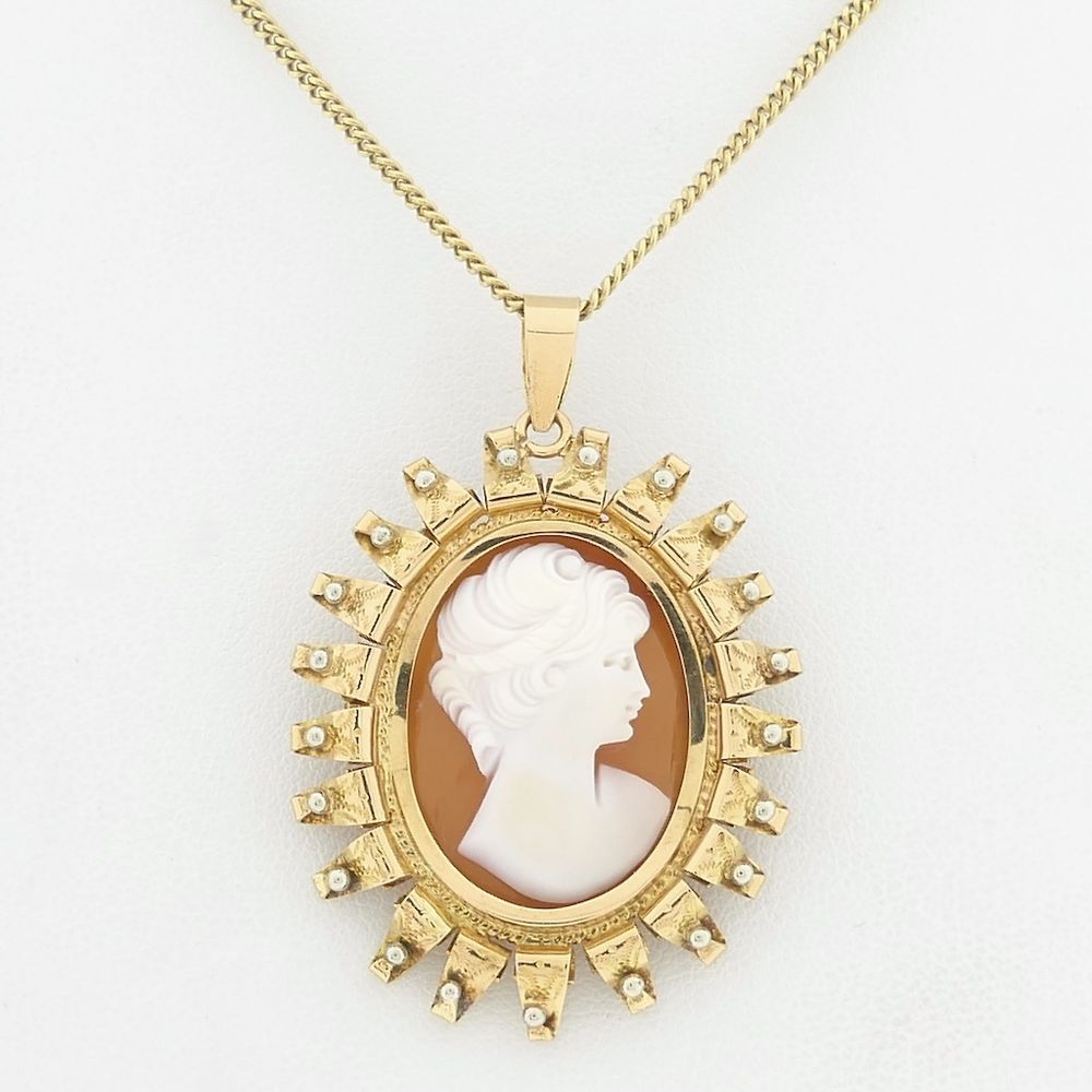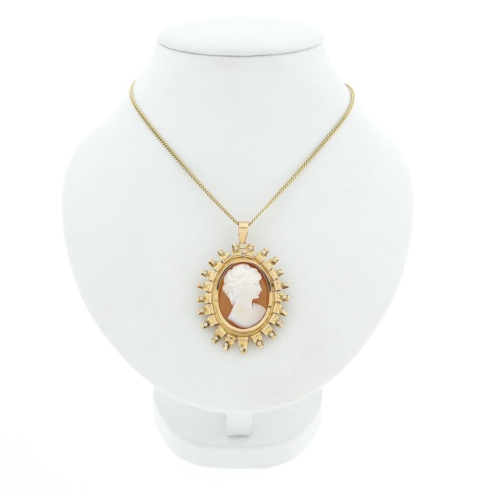 Gold pendant/brooch set with a cameo. The cameo features a beautifully carved portrait of a woman. The pendant/brooch is finished with a detailed vintage frame. Crafted from 18-karat yellow gold (750/1000), it is a statement piece.