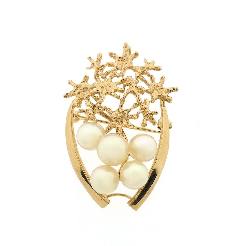 Vintage gold brooch/pendant set with five cultured pearls. The piece has a natural look and a smooth finish. Textured corals are set above the pearls. A beautiful accessory to complete your outfit. Crafted from 14-karat yellow gold (585/1000), the pendant/brooch can be fastened with a pin or worn as a pendant.