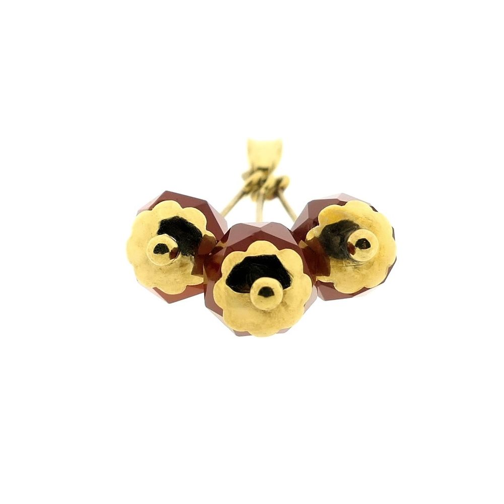 Vintage gold pendant with three faceted spheres in a cluster of carnelian. The carnelian has a beautiful orange-red color with a reddish glow in the light. It is an elegant, graceful pendant. The pendant is crafted from 14-karat yellow gold (585/1000).