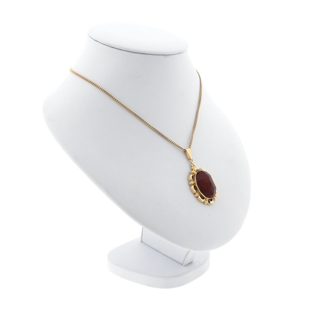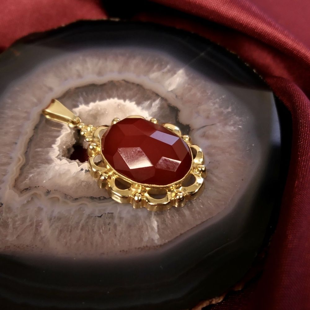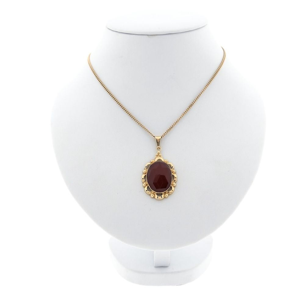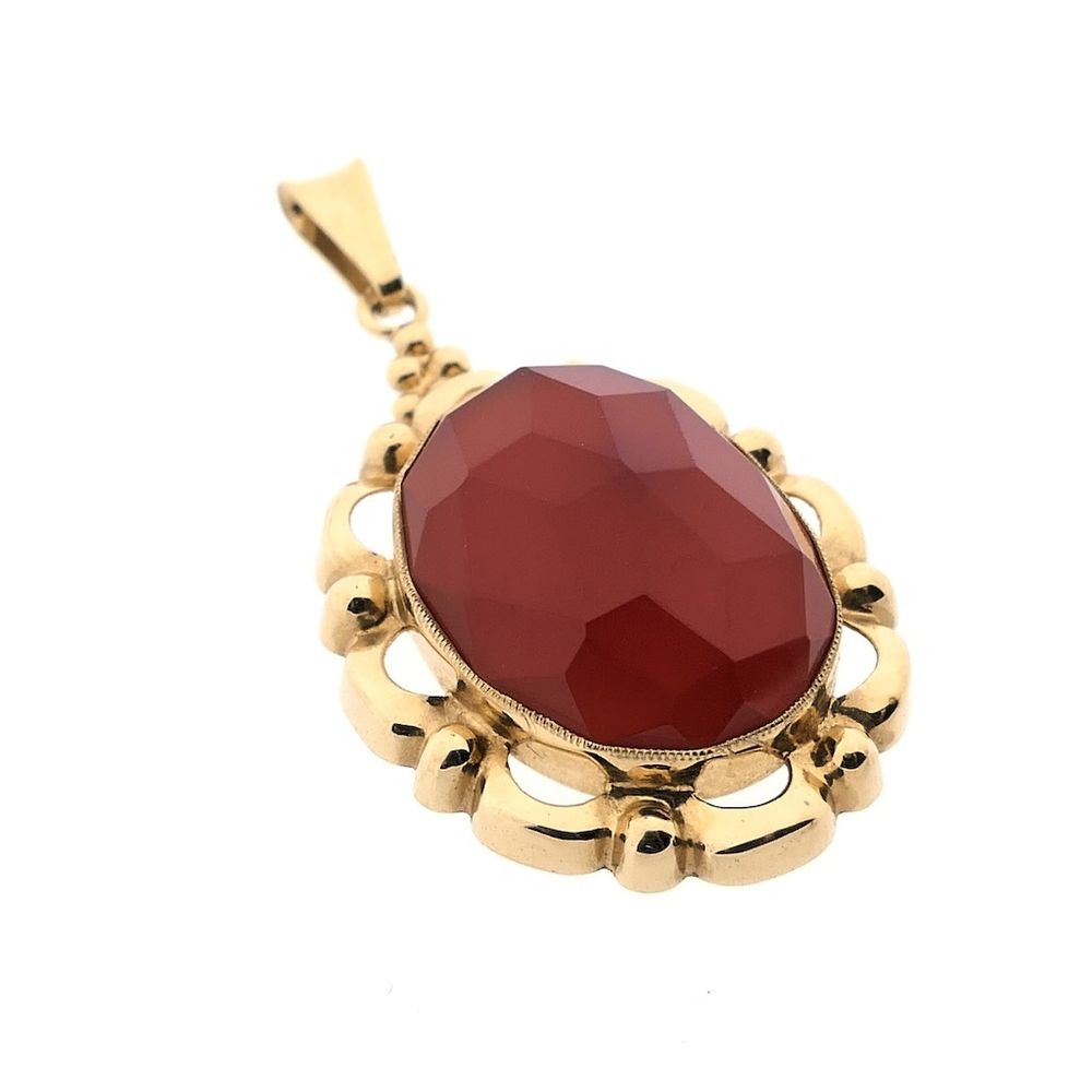 Gold pendant set with an oval facet-cut carnelian. The carnelian has a beautiful orange-red color with an orange glow in the light. The pendant is finished with a vintage frame and is crafted from 14-karat yellow gold (585/1000).