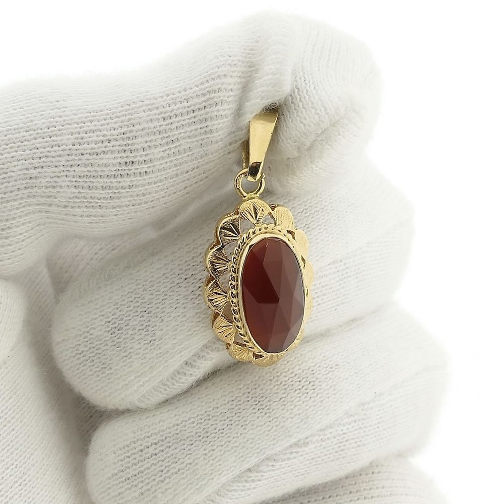 Vintage gold pendant set with an oval facet-cut carnelian. The carnelian has a beautiful orange-red color with a reddish glow in the light. The pendant is finished with an elegant frame and features a classic design with beautiful engravings. Crafted from 14-karat yellow gold (585/1000), it is a gemstone of the original.