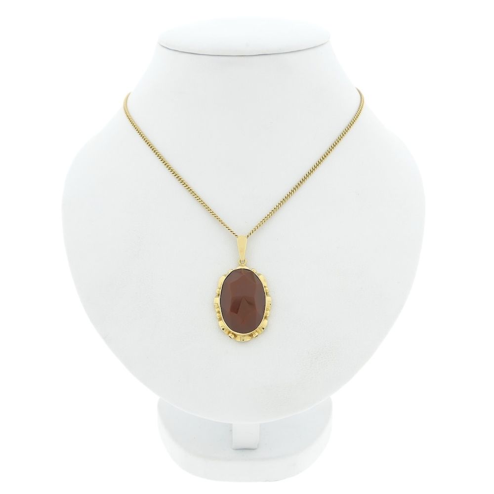 Gold pendant set with an oval facet-cut carnelian. The carnelian has a beautiful orange-red color with an orange glow in the light. The pendant is finished with a vintage frame. The piece is crafted from 14-karat yellow gold (585/1000).