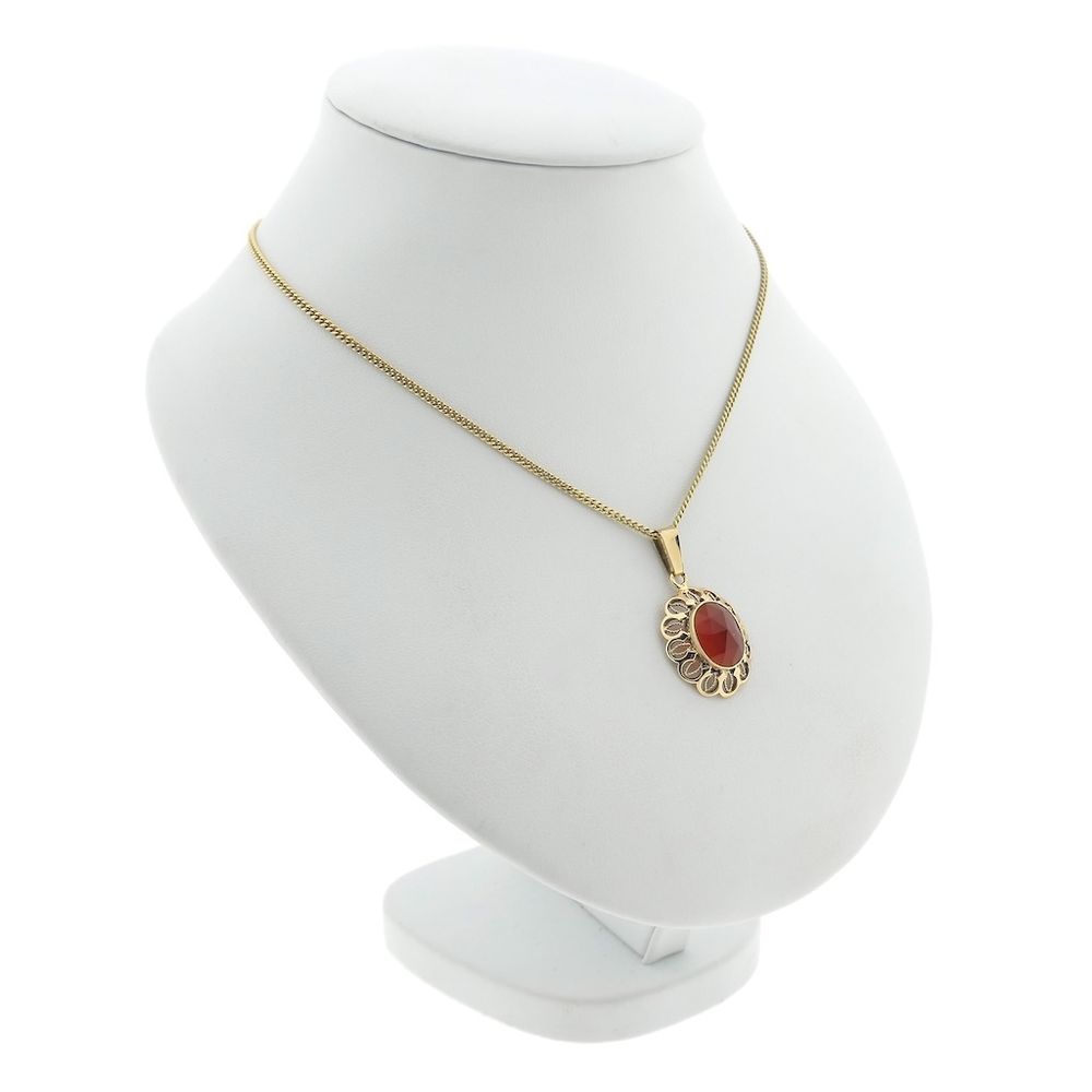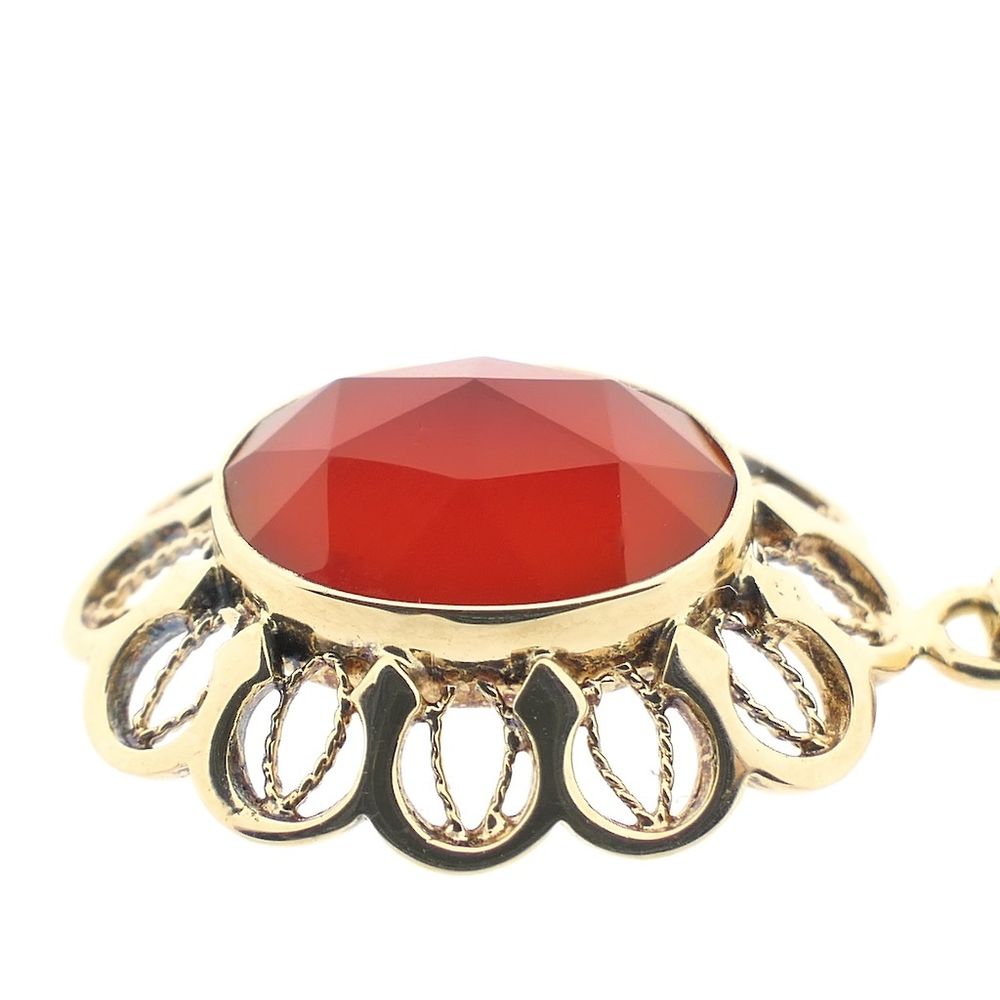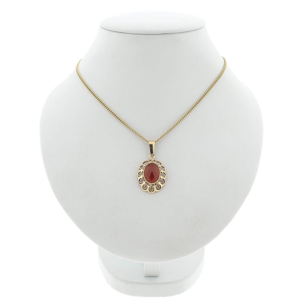 Gold pendant set with a carnelian. The carnelian has a beautiful orange-red color with an orange glow in the light. The pendant is finished with a vintage frame. The piece is crafted from 14-karat yellow gold (585/1000).