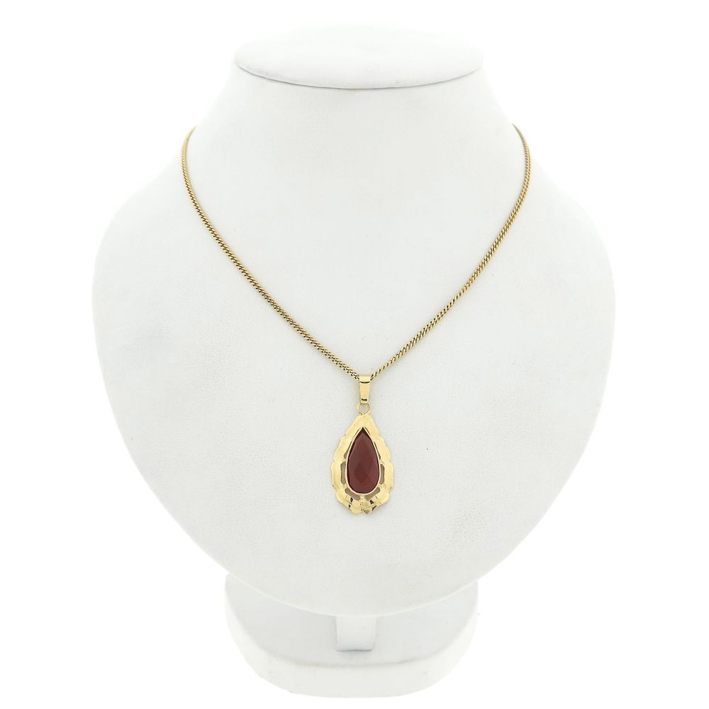 Gold pendant set with a teardrop-shaped cut carnelian. The carnelian has a beautiful orange-red color with an orange sheen in the light and is finished with a stylish frame. The pendant is made of 14-carat yellow gold (585/1000).