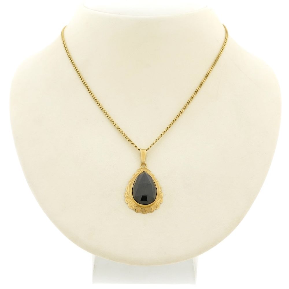 Vintage gold pendant with a droplet faceted garnet stone. The garnet is a beautiful dark red and slightly translucent. The setting gives the piece an antique look. The pendant is crafted from 14-karat yellow gold (585/1000).