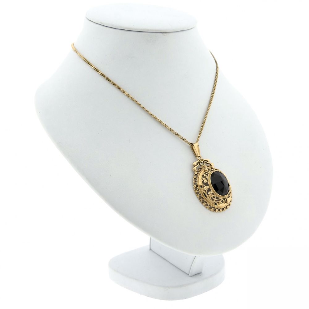 Vintage gold pendant set with an oval faceted garnet. The garnet is a beautiful dark red. The bezel is beautifully detailed. The pendant is crafted from 14-karat yellow gold (585/1000).