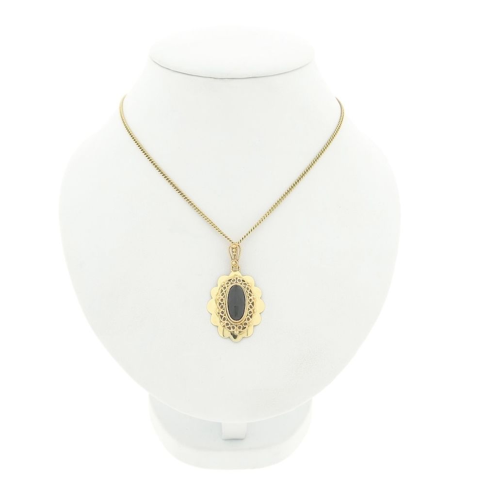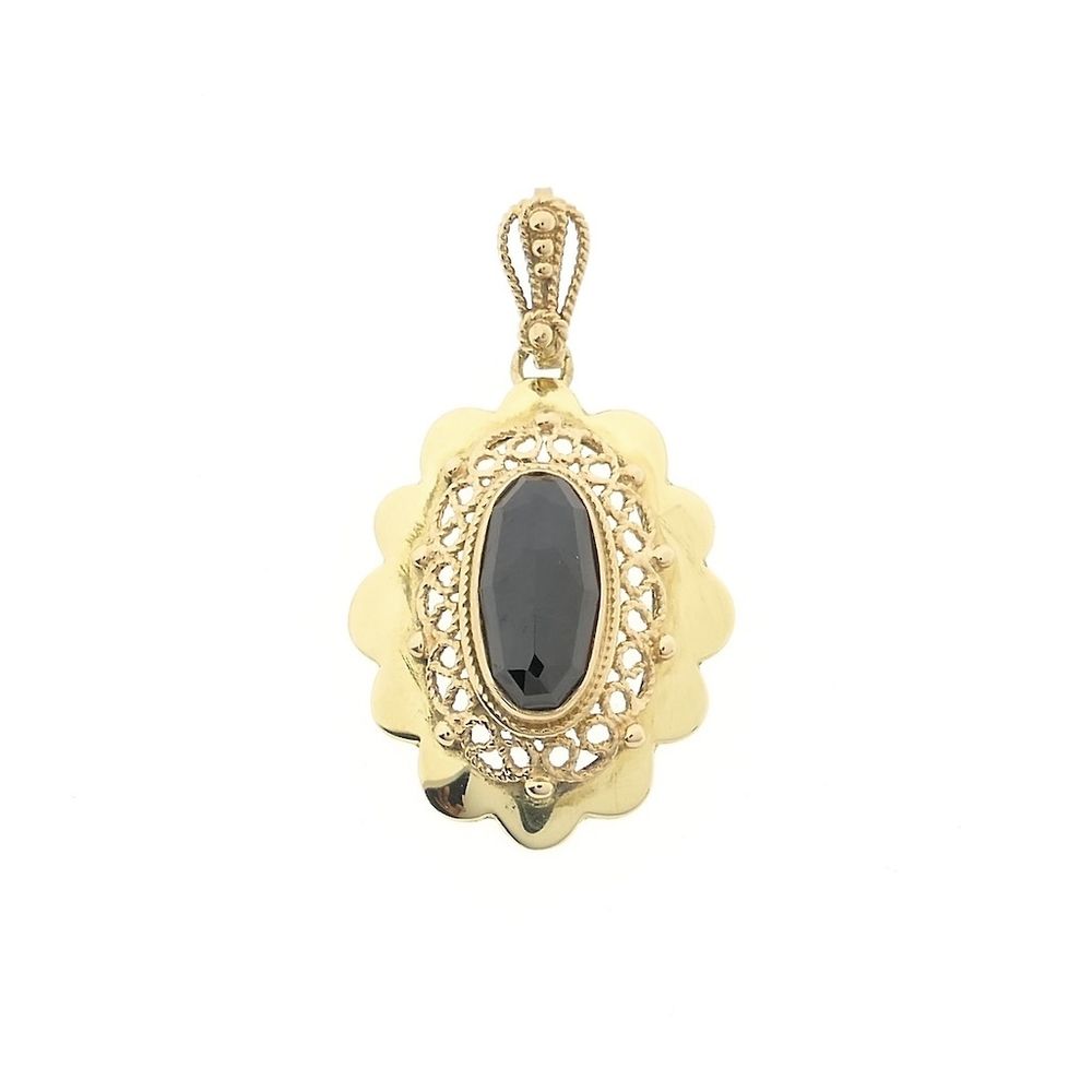 Vintage gold pendant set with an oval faceted garnet. The garnet measures 13.4 x 6.8 mm in diameter and is a beautiful dark red. The setting is crafted using the filigree technique, a technique in which very fine wire is used to create lace-like patterns. A beautiful and classic pendant with a vintage look. The pendant is crafted from 14-karat yellow gold (585/1000).