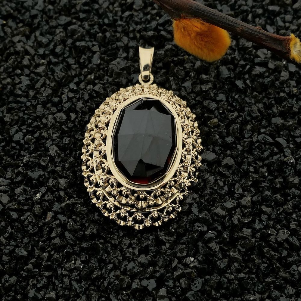 Vintage gold pendant set with a garnet stone. The garnet is a beautiful dark red. The elegant double-layered frame is beautifully detailed. The pendant is crafted from 14-karat yellow gold (585/1000).