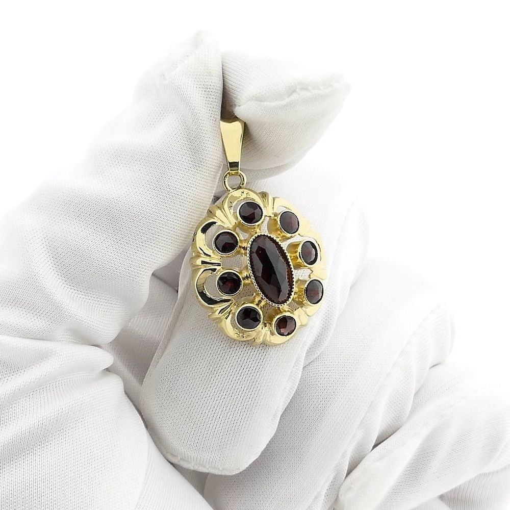 Gold pendant with an oval faceted garnet and a ring of small garnets. The garnet is a beautiful dark red and slightly translucent. A beautiful pendant with a classic, vintage look. The pendant is crafted from 14-karat yellow gold (585/1000).
