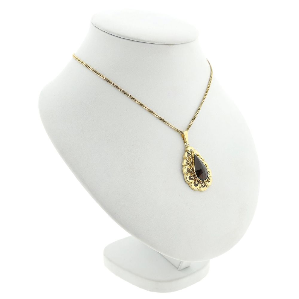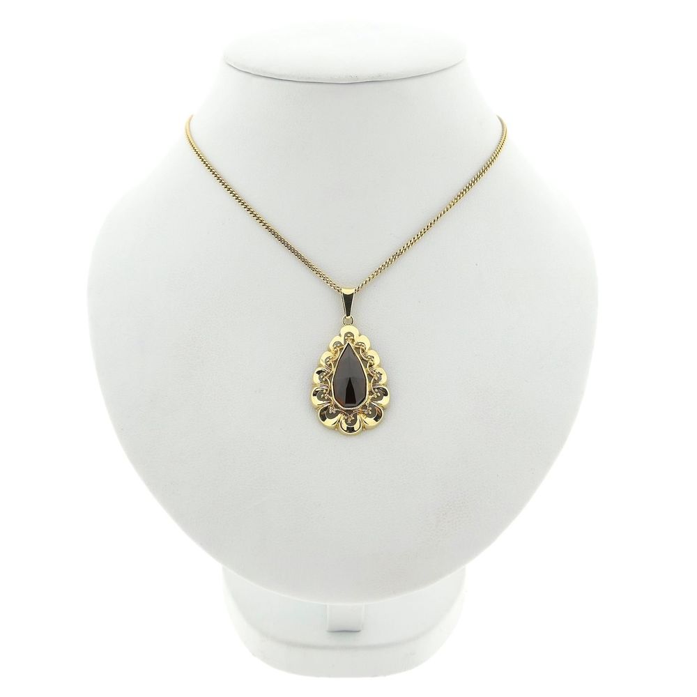 Vintage gold pendant set with a teardrop-shaped, faceted garnet. The garnet is a beautiful brownish-red color. The bezel is beautifully detailed. The pendant is crafted from 14-karat yellow gold (585/1000).