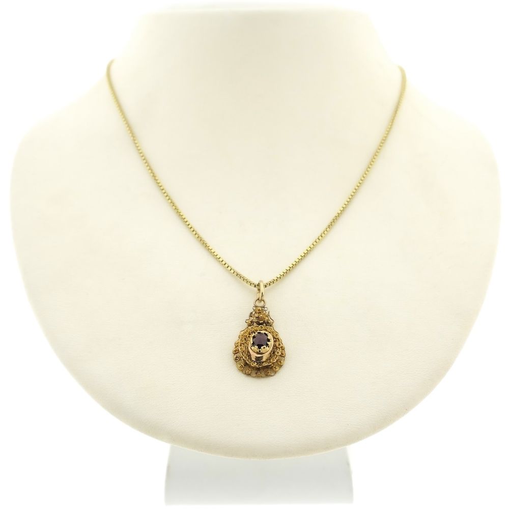 Vintage gold pendant with garnet; filigree technique