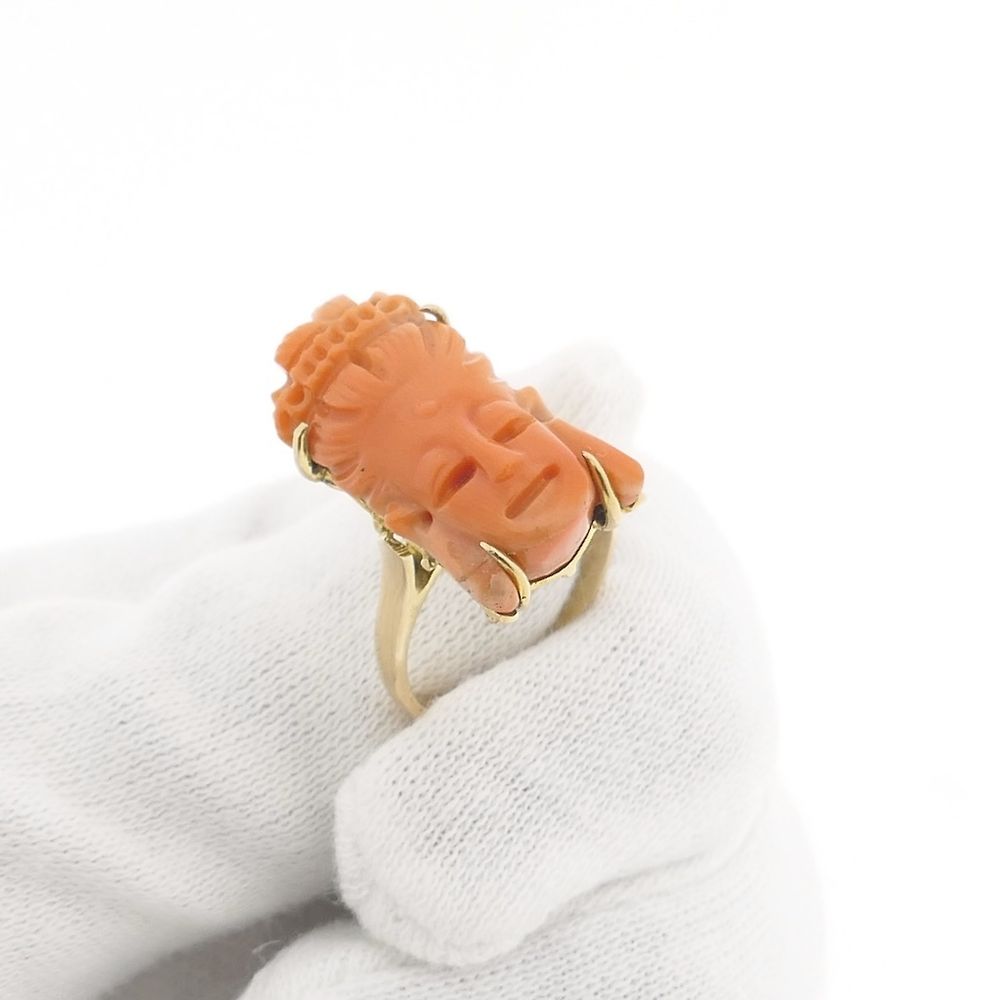 A beautiful gold ring set with carved red coral. The red coral is cut in the shape of Kuan Yin's face. The ring has an antique look and is crafted from 14-karat yellow gold (585/1000). (Also lovely to wear with the same Kuan Yin earrings.) Kuan Yin is an influential figure in both Buddhism and Taoism, particularly in East Asian cultures. She is revered as a bodhisattva who symbolizes compassion and mercy. She is often depicted as a peaceful and comforting feminine presence, helping people in times of pain or need. Her name literally means "she who hears the voices of the world," and many invoke her for support and protection.