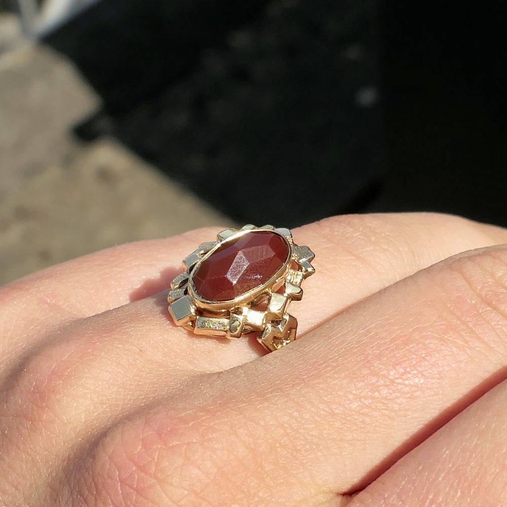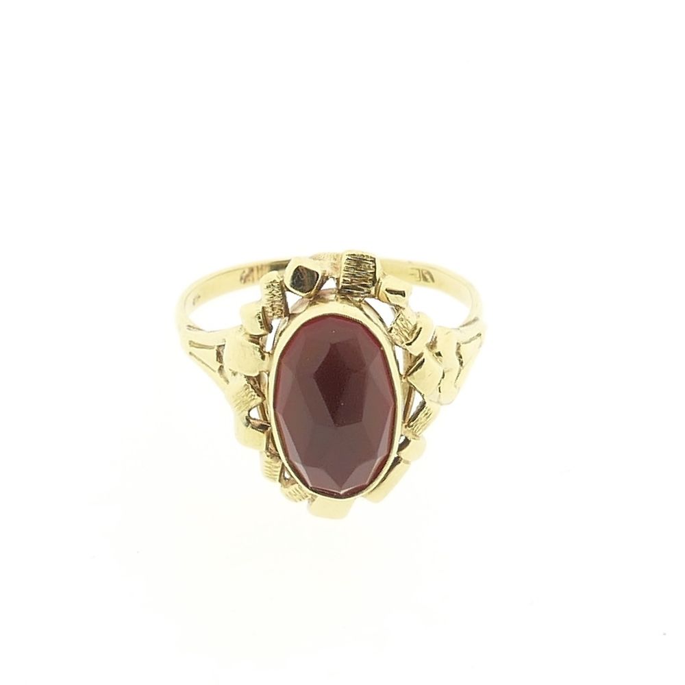 Vintage gold ring set with an oval facet-cut carnelian. The ring has a classic look and is crafted from 14-karat yellow gold (585/1000).