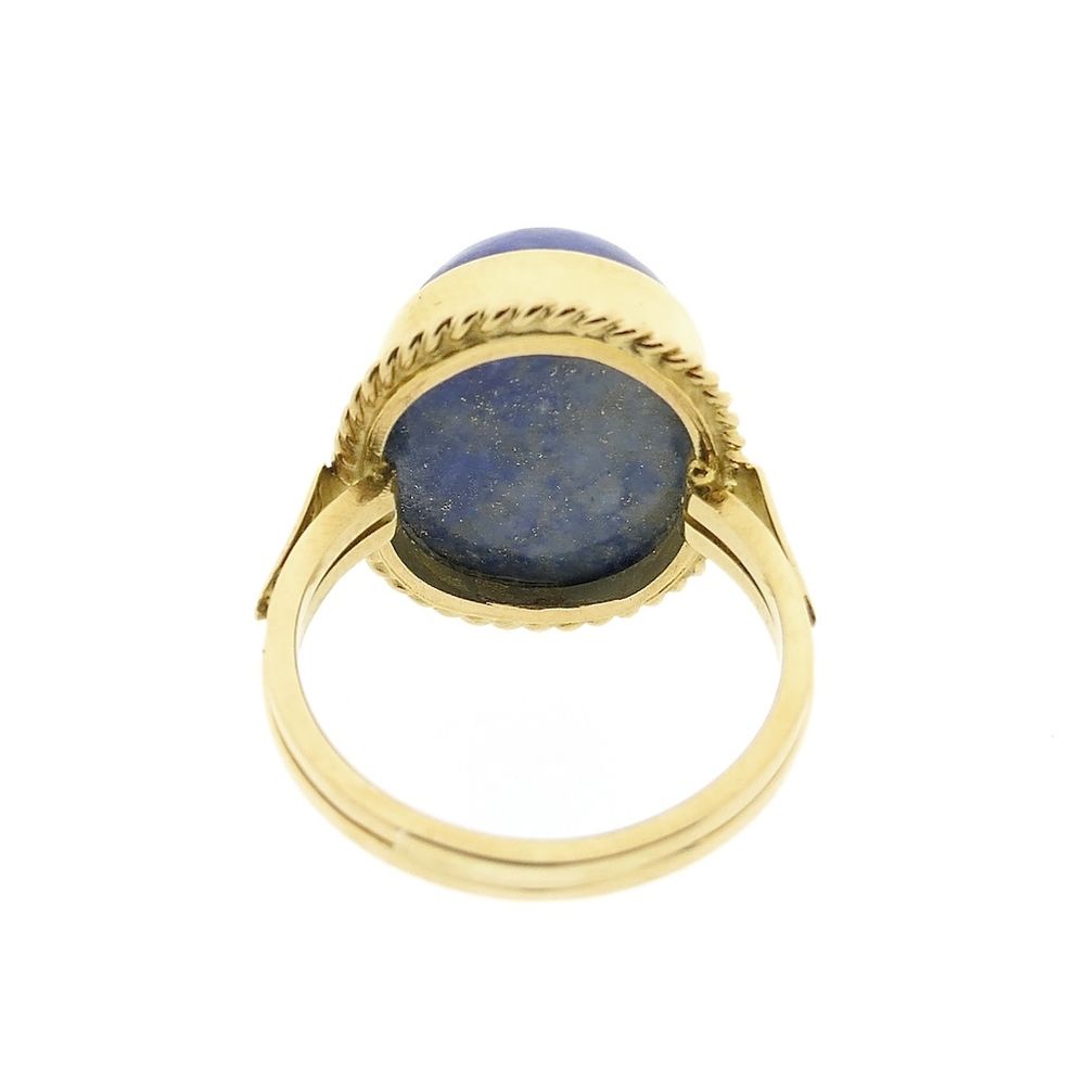 Vintage gold ring set with a lapis lazuli stone. The ring has an elegant look and is a real eye-catcher. The stone is oval cabochon-cut with a diameter of 14.9 mm. This beautiful women's ring is crafted from 14-karat yellow gold (585/1000).