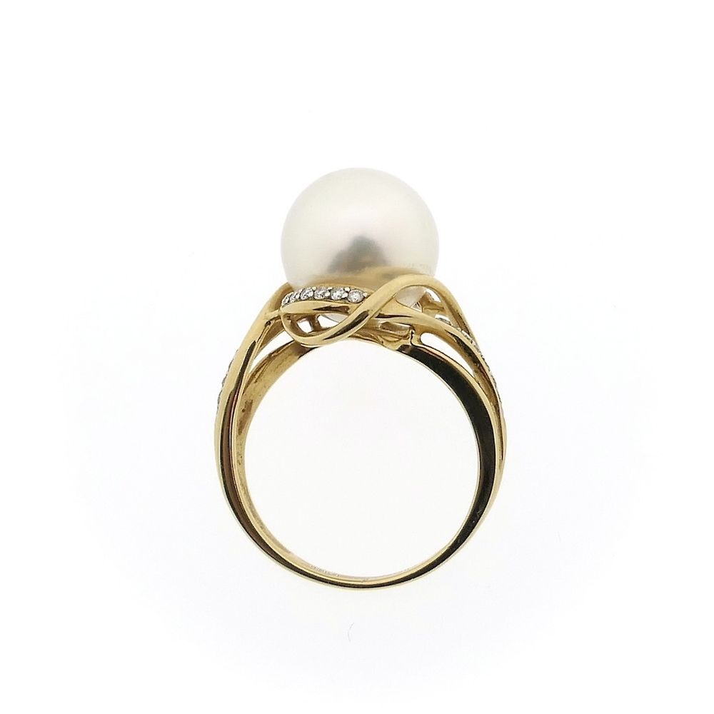 Gold ring set with a cultured pearl and twenty-six stunning round brilliant-cut diamonds with a total weight of 0.13 ct. The ring has a luxurious and elegant appearance. A beautiful women's ring. The pearl has a diameter of 12.0 mm. The ring is crafted from 14-karat yellow gold (585/1000).
