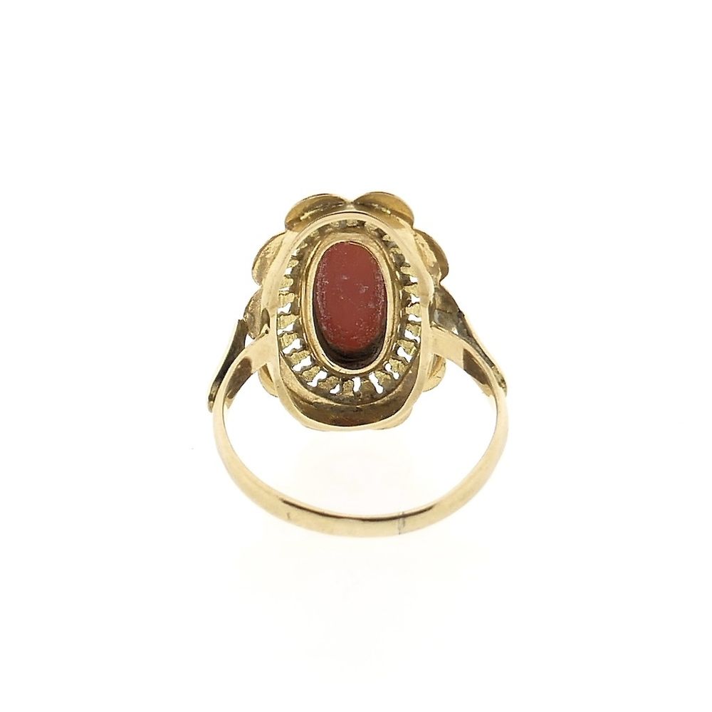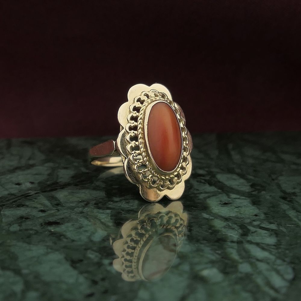A beautiful gold ring set with blood coral. The ring has a vintage look and is crafted from 14-karat yellow gold (585/1000).