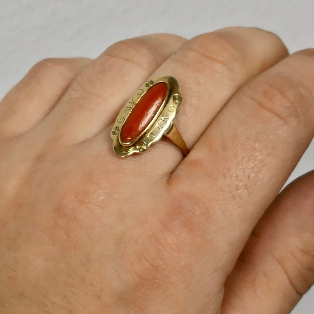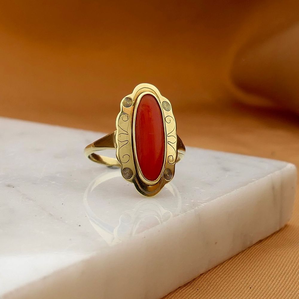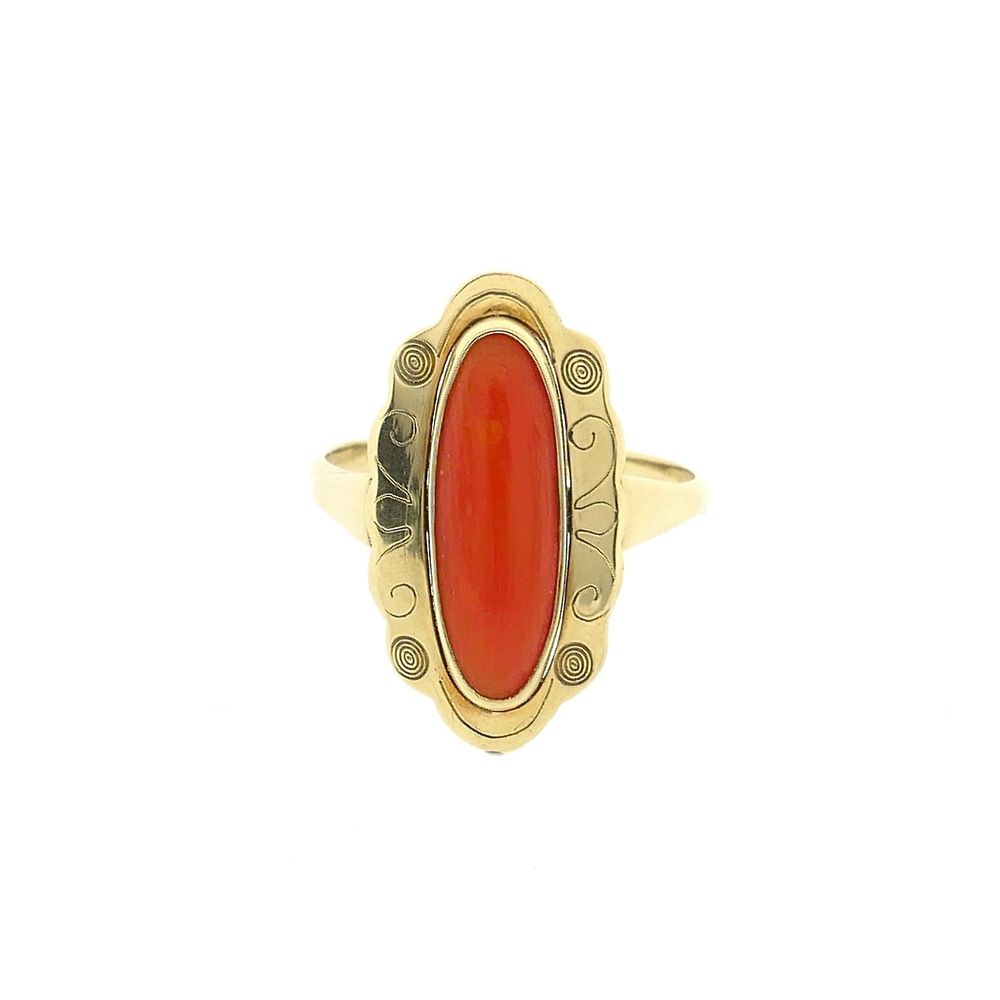 Gold ring set with an oval cabochon-cut red coral. The stone has a vintage engraved setting. This beautiful ring is crafted from 14-karat yellow gold (585/1000).