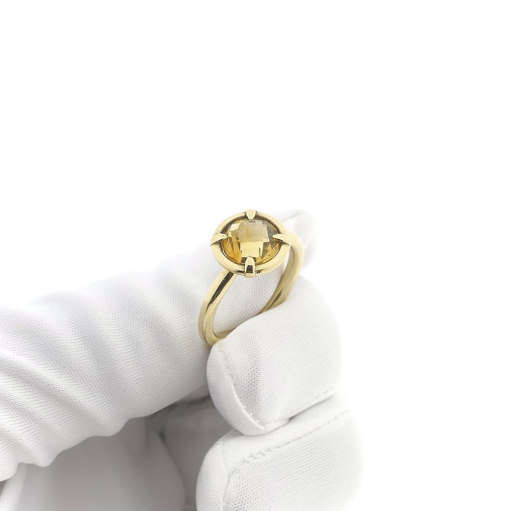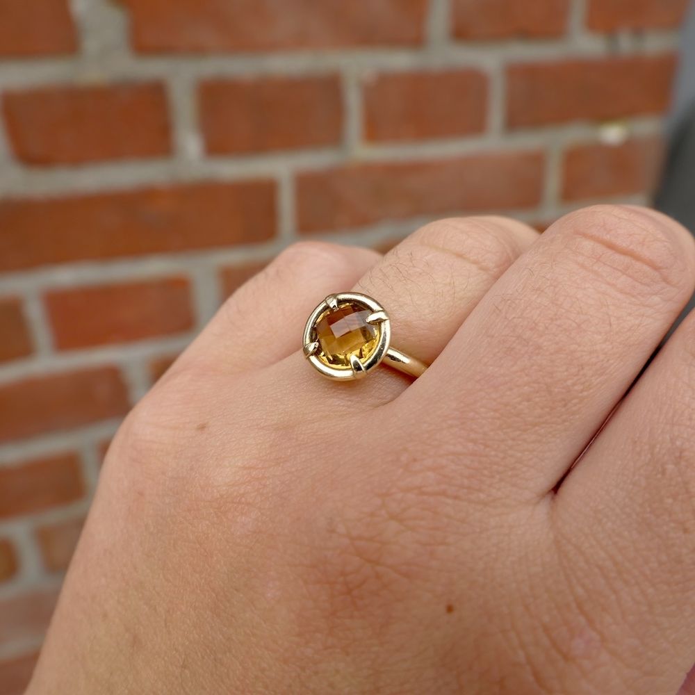 Vintage gold solitaire ring set with a large, striking citrine. The citrine is bright and orange-yellow in color. The stone is round faceted and has a diameter of 8.5 mm. The ring is crafted from 14-karat yellow gold (585/1000).